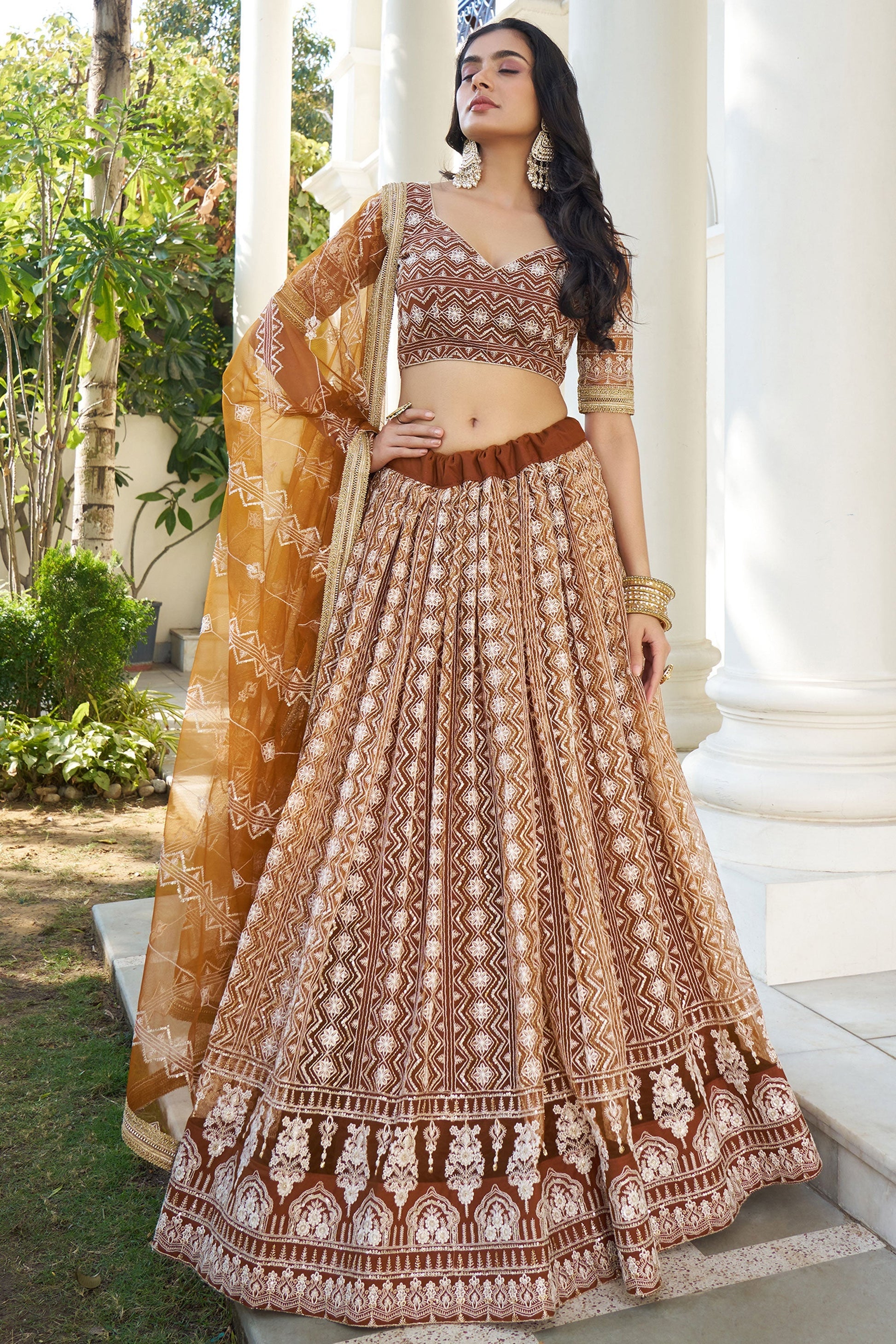 टेक्स्ट ब्लॉक ब्राउन कलर के नेट फैब्रिक लहंगे पर अद्भुत सेक्विन वर्क
