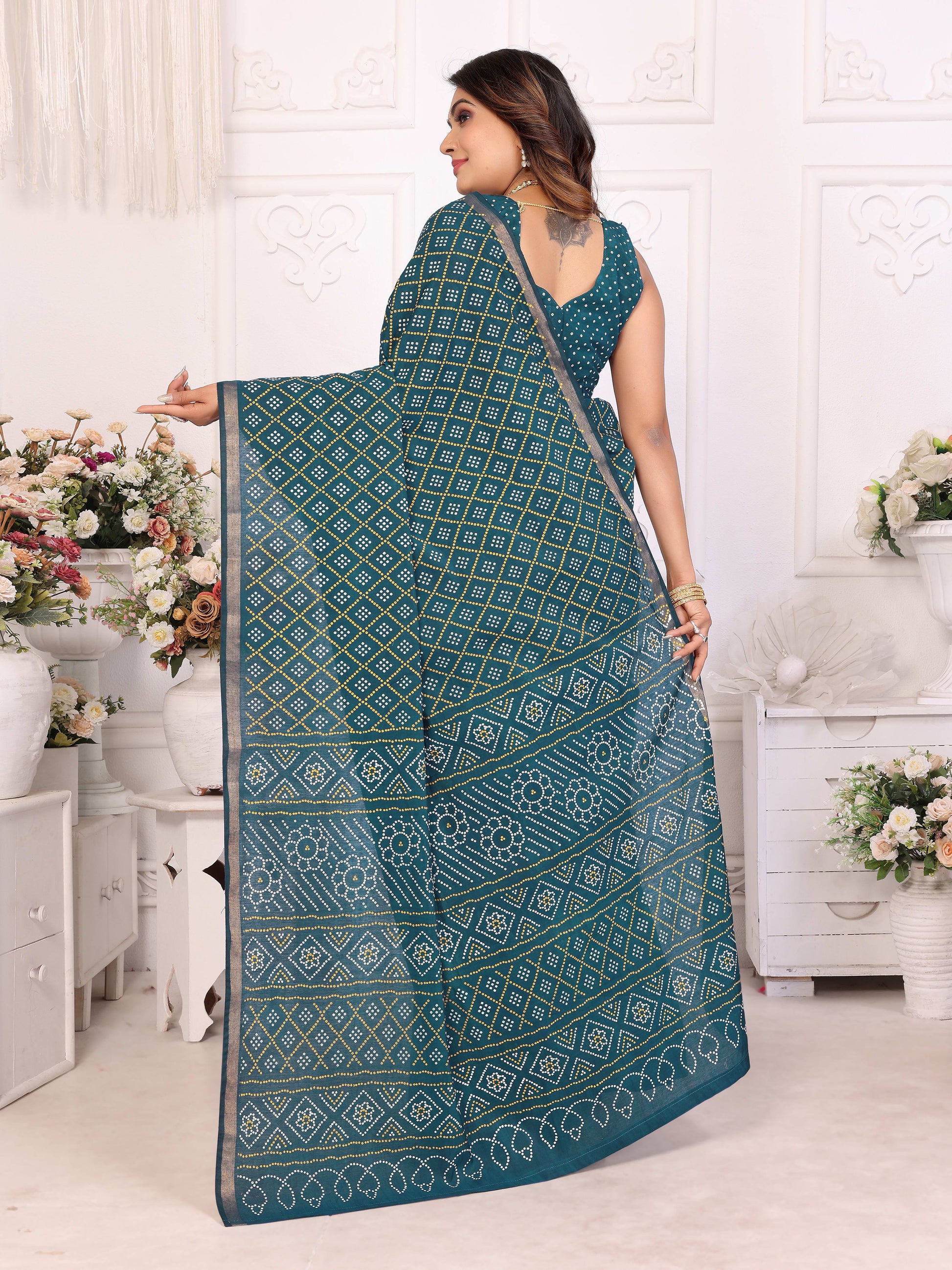 साड़ी का फ़ैब्रिक:- शुद्ध पटोला और बंधेज पैटर्न वाला मुलायम कॉटन, प्राकृतिक रंग प्रिंट और ज़री बुनाई वाला बॉर्डर