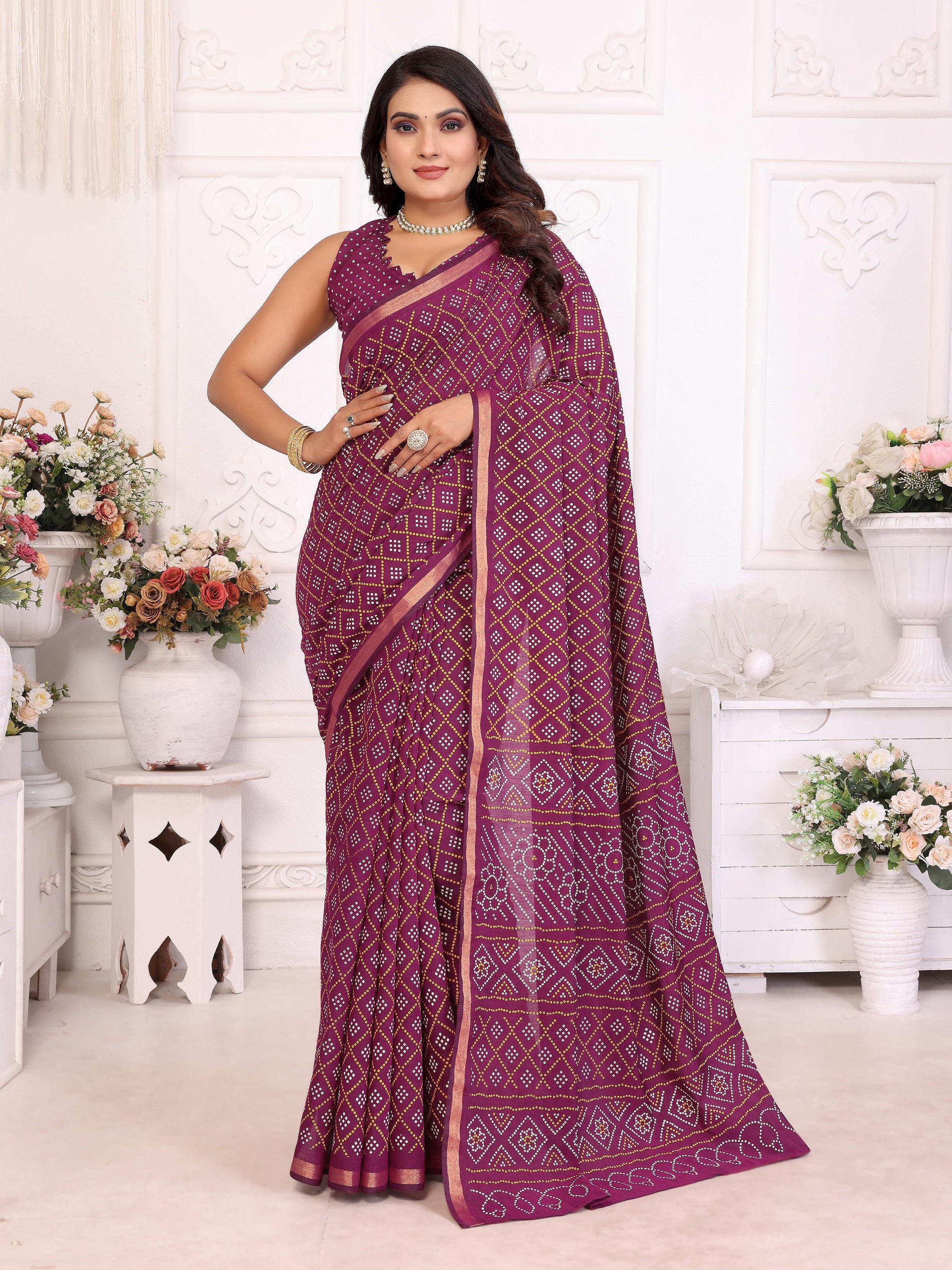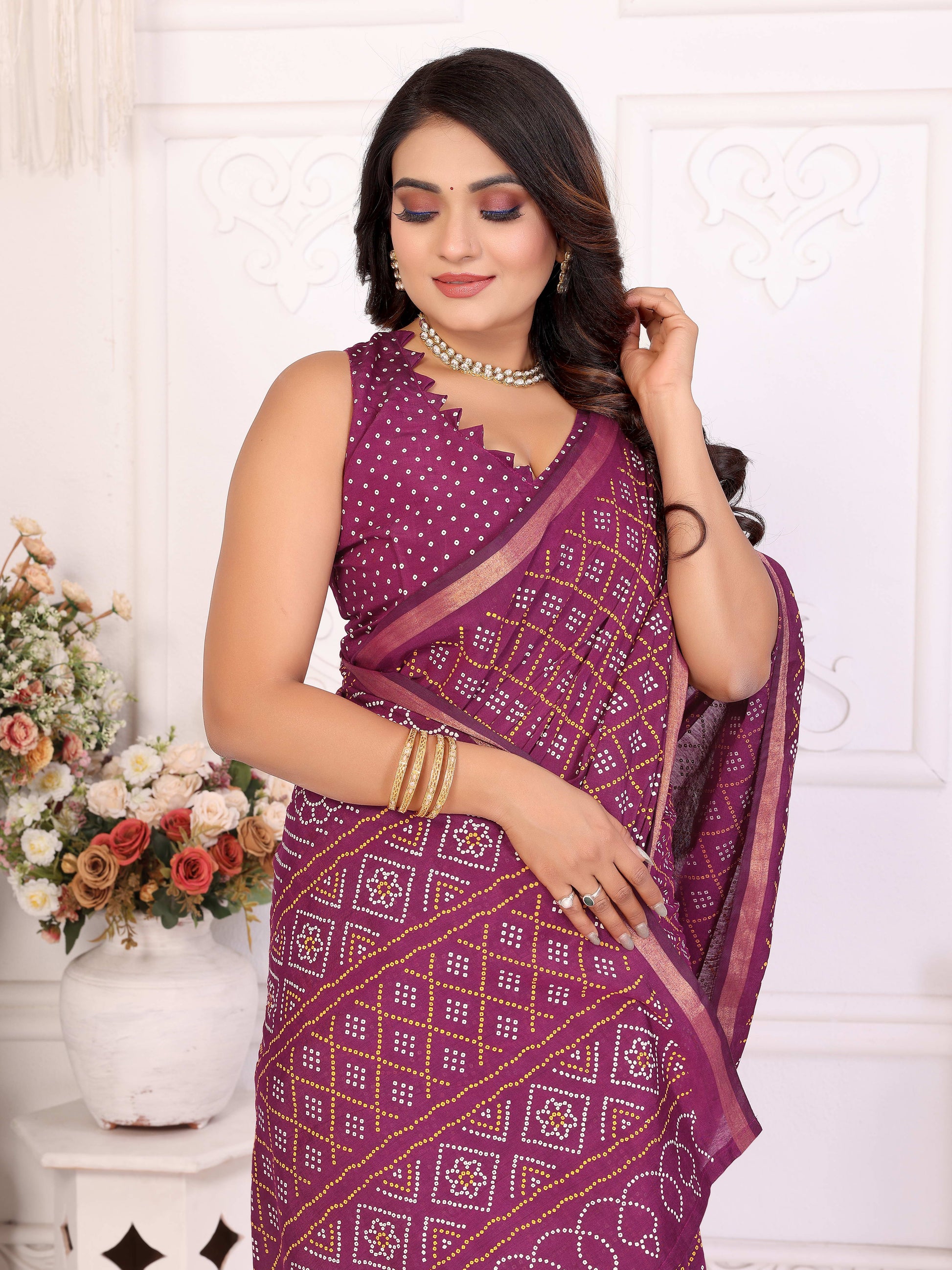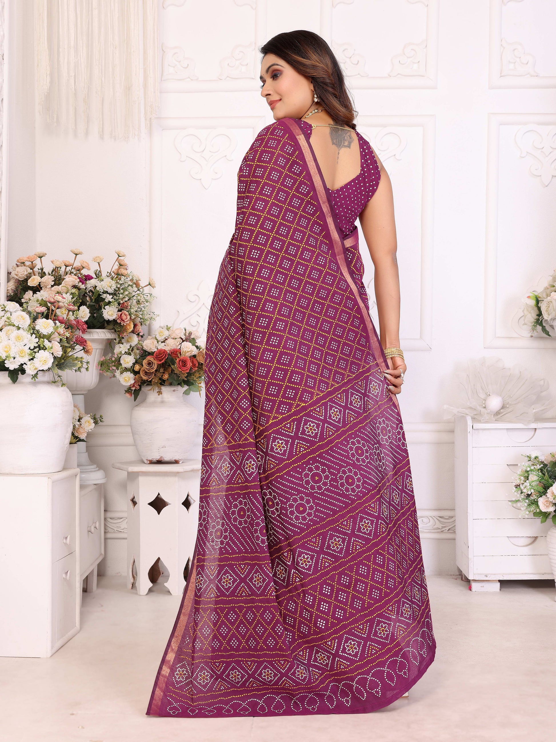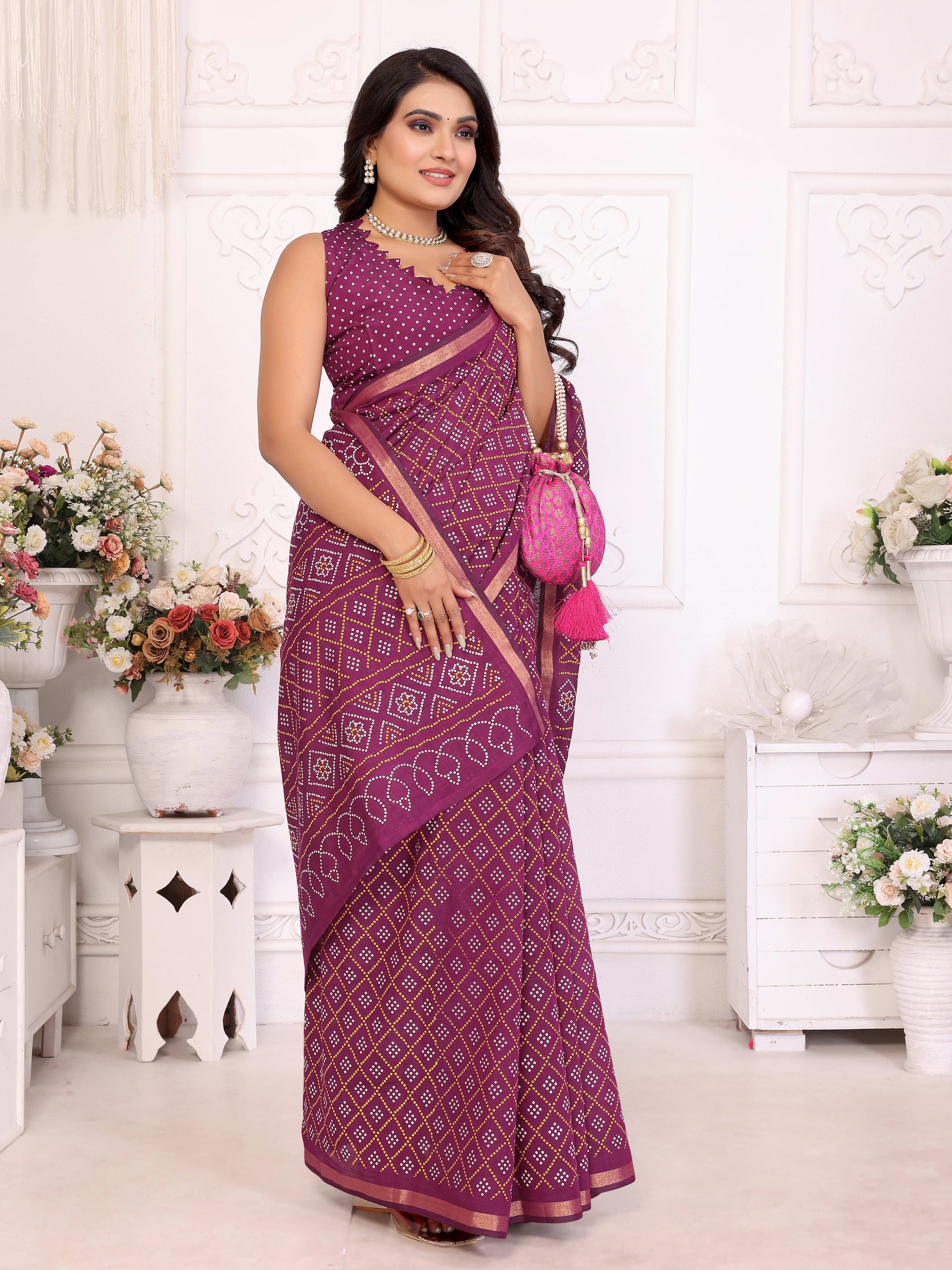 बैंगनी अंबा शुद्ध पटोला और बंधेज पैटर्न मुलायम सूती हल्के वजन की साड़ी