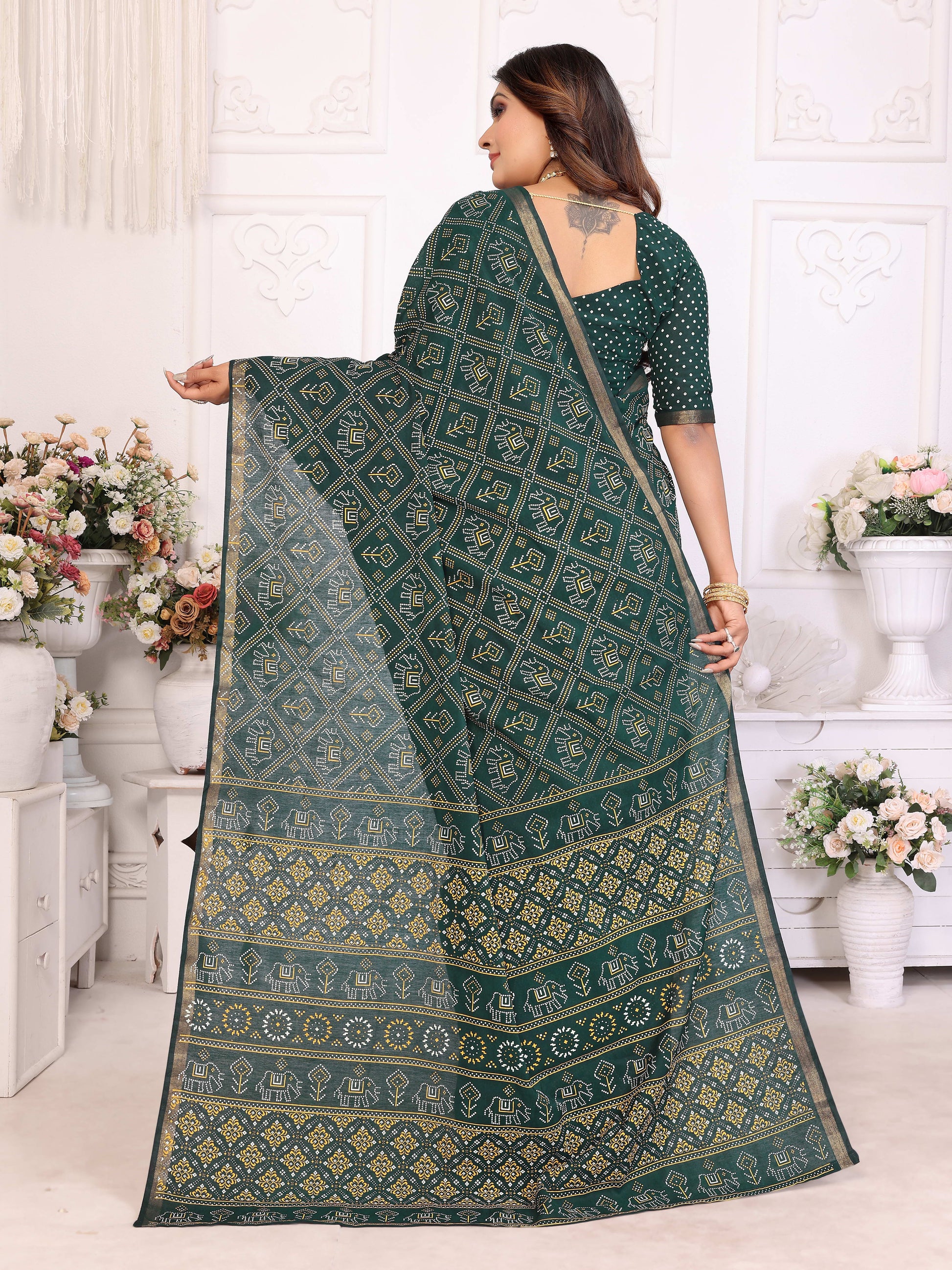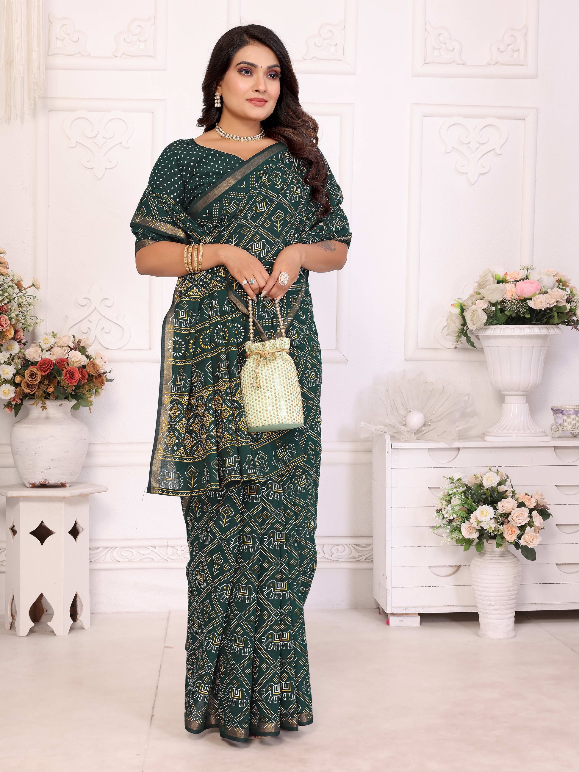 टेक्स्ट ब्लॉक हरी अंबिका शुद्ध पटोला और बंधेज पैटर्न नरम सूती हल्के वजन की साड़ी