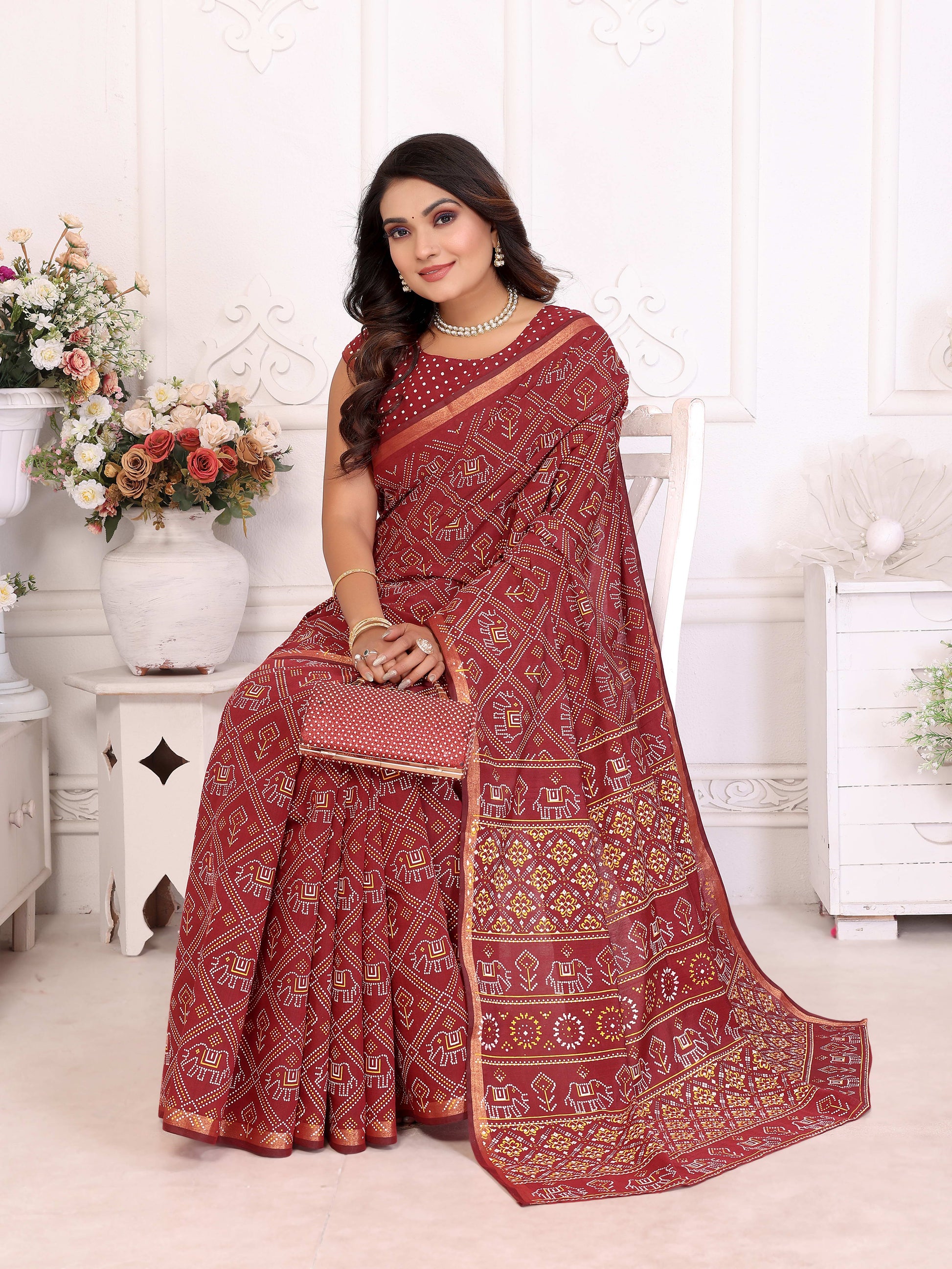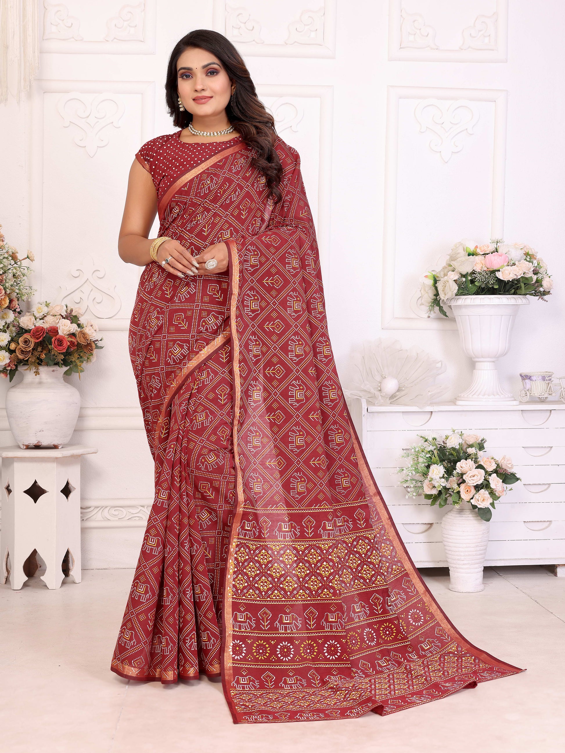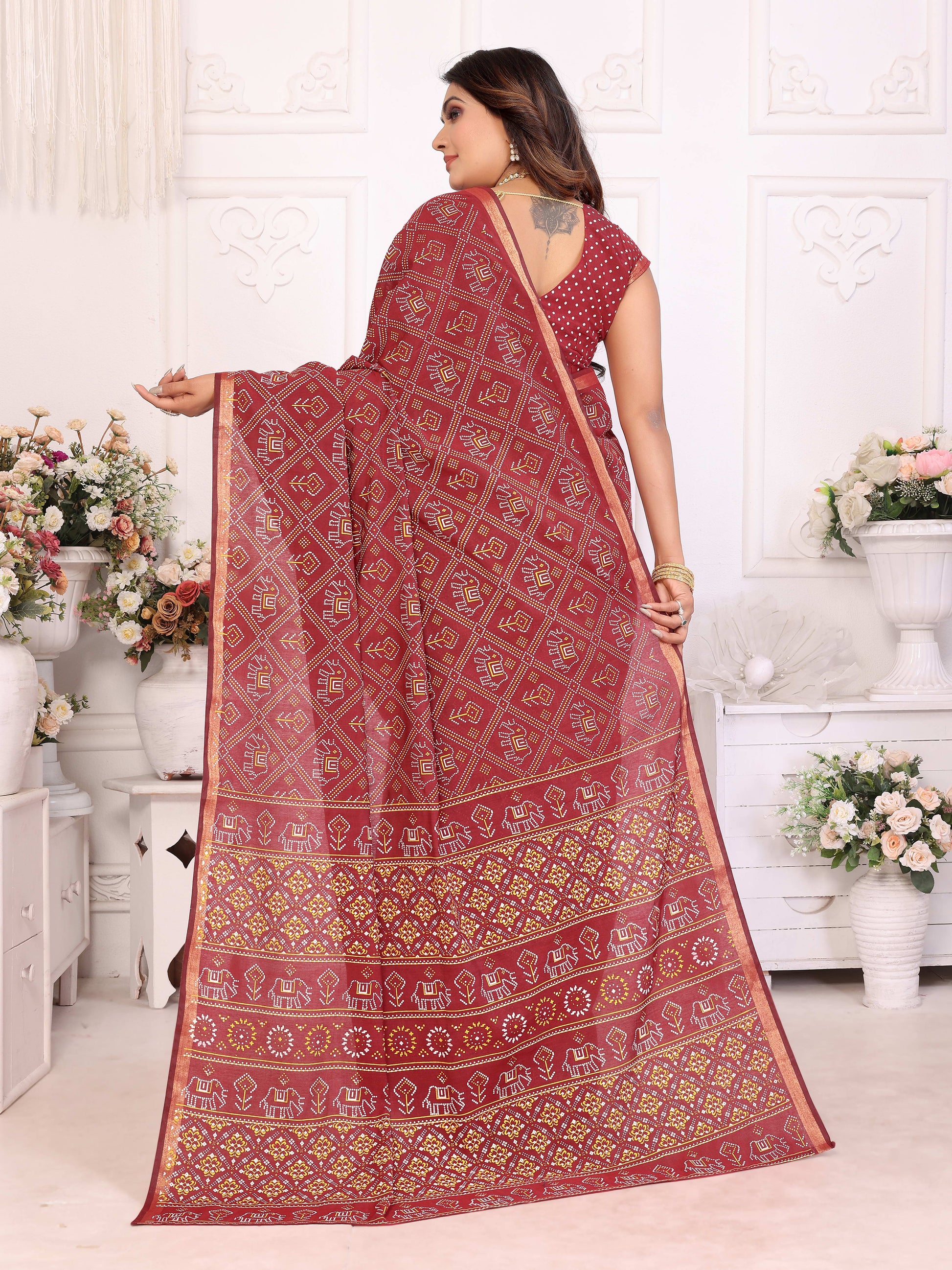 मैरून अंबिका शुद्ध पटोला और बंधेज पैटर्न नरम सूती हल्के वजन की साड़ी