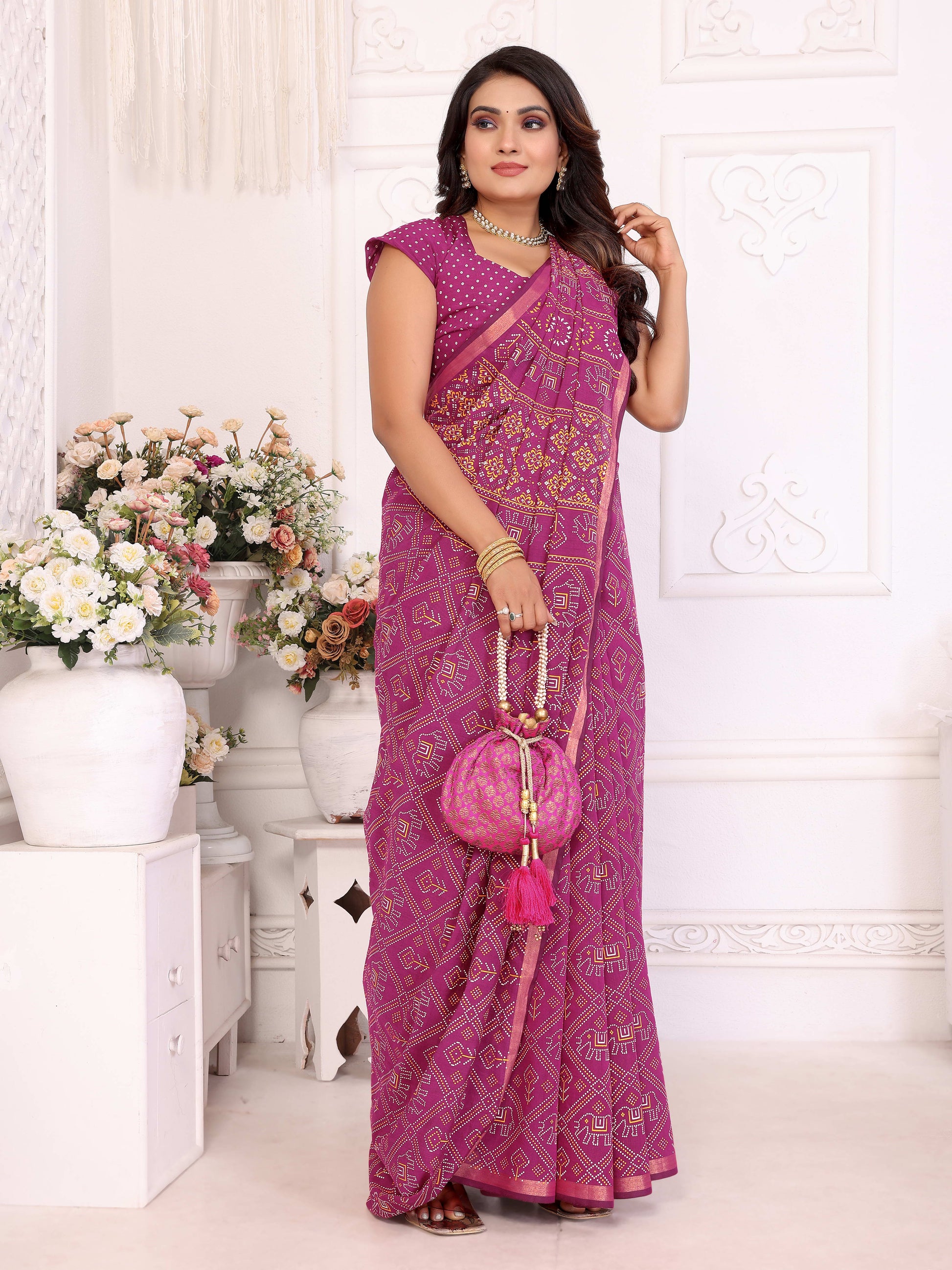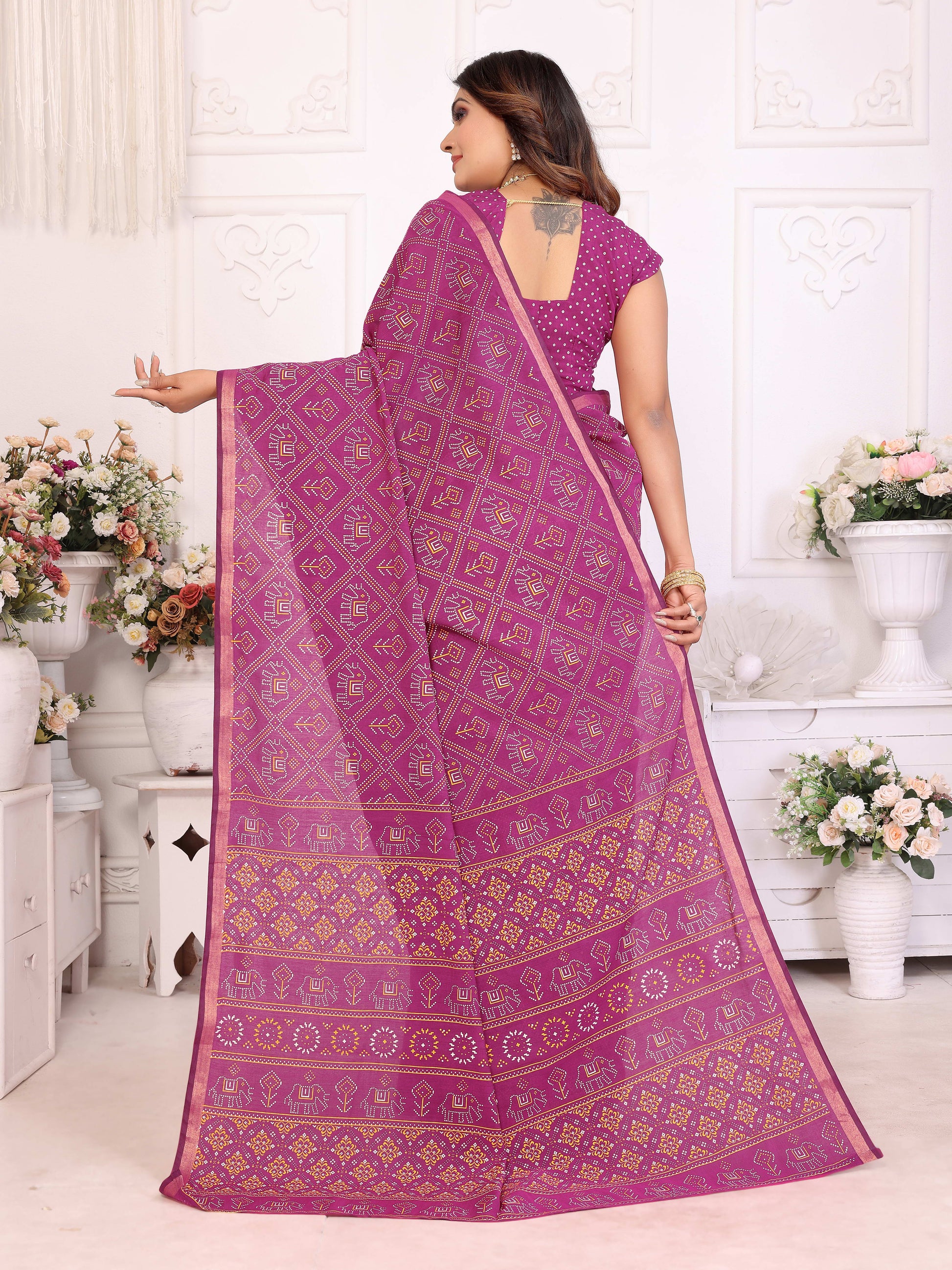 साड़ी का फ़ैब्रिक:- शुद्ध पटोला और बंधेज पैटर्न वाला मुलायम कॉटन, प्राकृतिक रंग प्रिंट और ज़री बुनाई वाला बॉर्डर