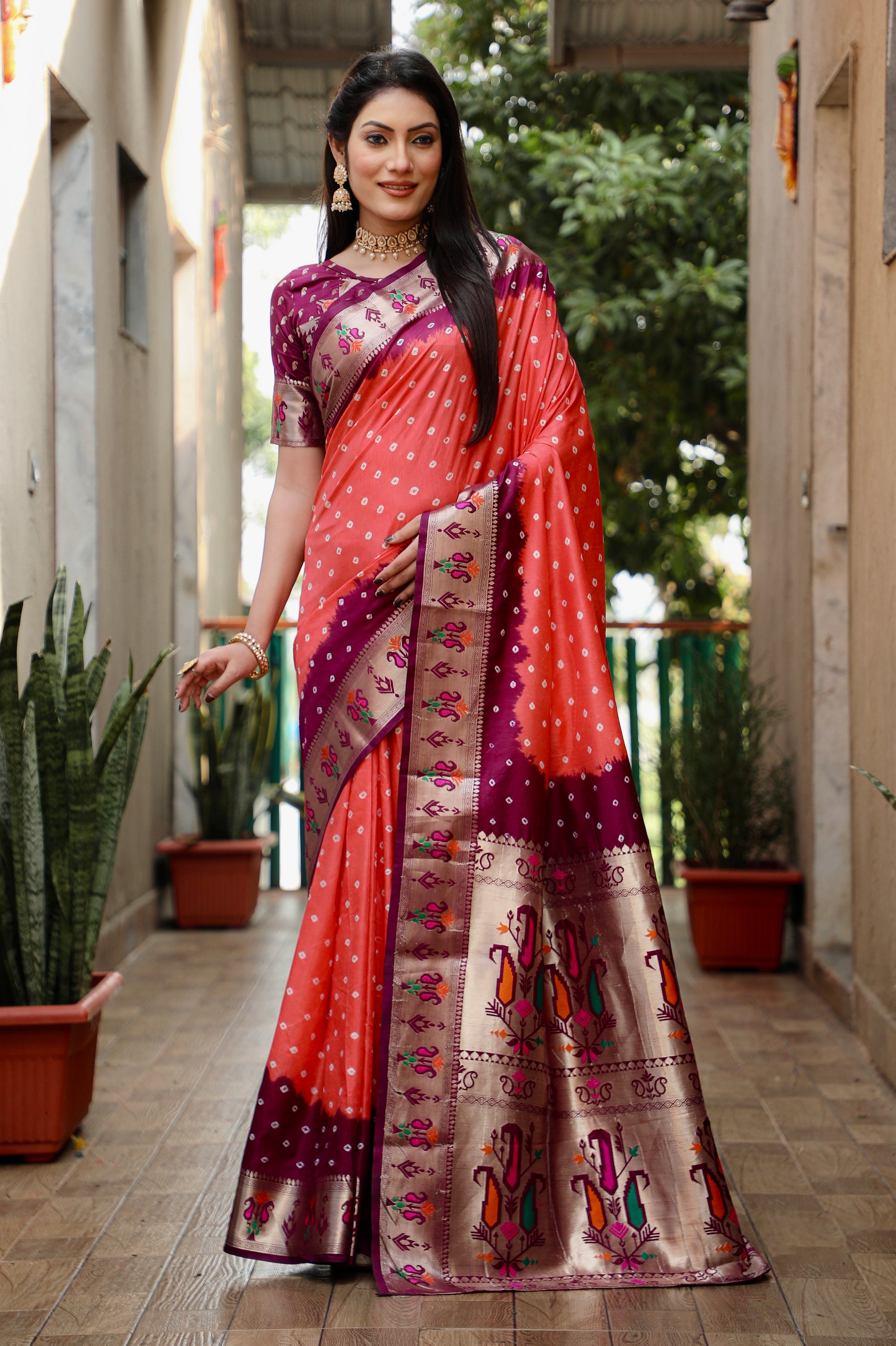 जरी पैठानी बुनाई बॉर्डर के साथ पीच चंदानी डोला सॉफ्ट सिल्क बंधेज साड़ी