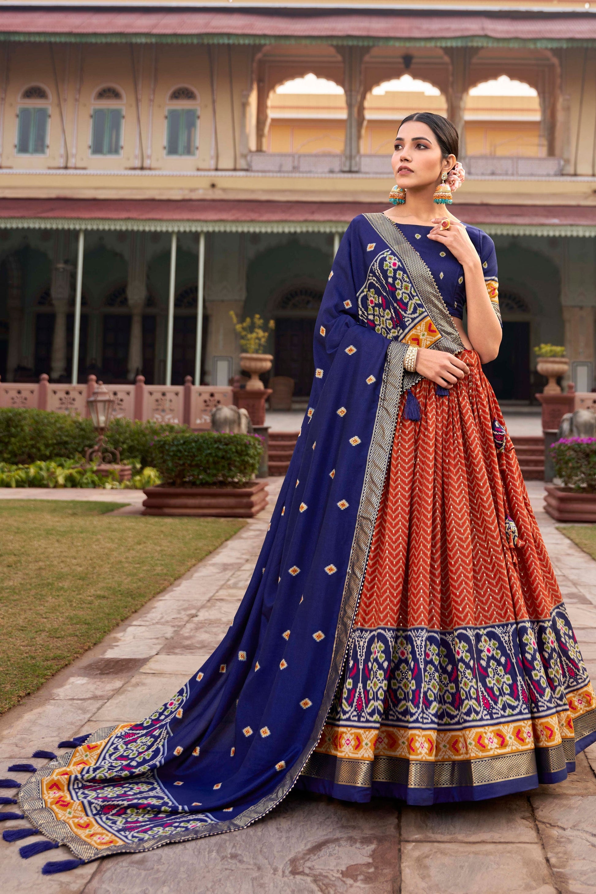 टेक्स्ट ब्लॉक आर्ट सिल्क फैब्रिक मनमोहक ऑरेंज कलर का पटोला स्टाइल फॉयल प्रिंटेड लहंगा