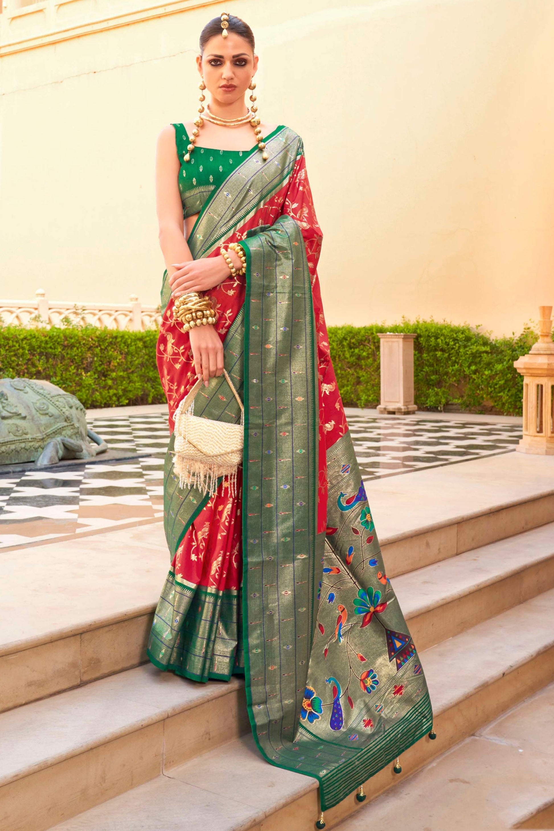 टेक्स्ट ब्लॉक आर्ट सिल्क फ़ैब्रिक मैरून रंग की साड़ी विंसोम पैठिनी प्रिंटेड वर्क के साथ