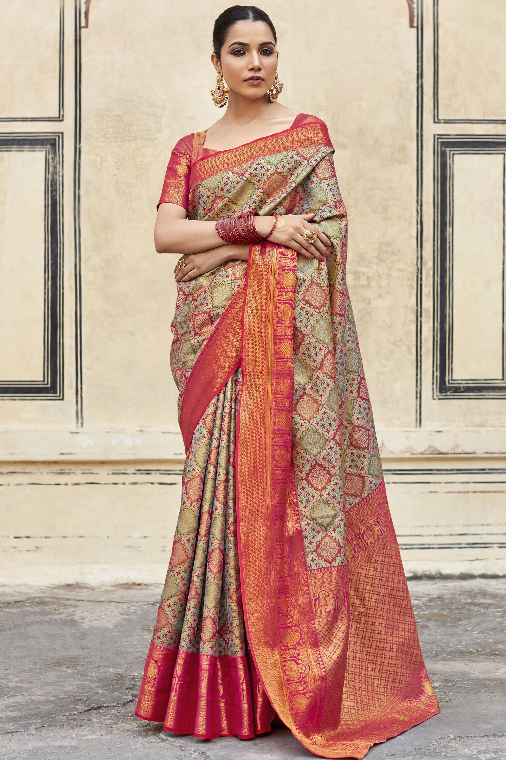 टेक्स्ट ब्लॉक आर्ट सिल्क फ़ैब्रिक मल्टी कलर बुनाई वर्क फैंसी साड़ी