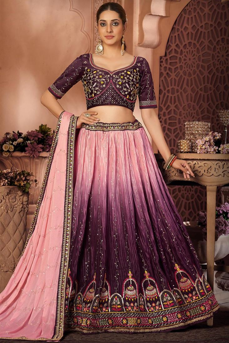 टेक्स्ट ब्लॉक आकर्षक फंक्शन वियर पीच सेक्विन वर्क चिनॉन फ़ैब्रिक लहंगा