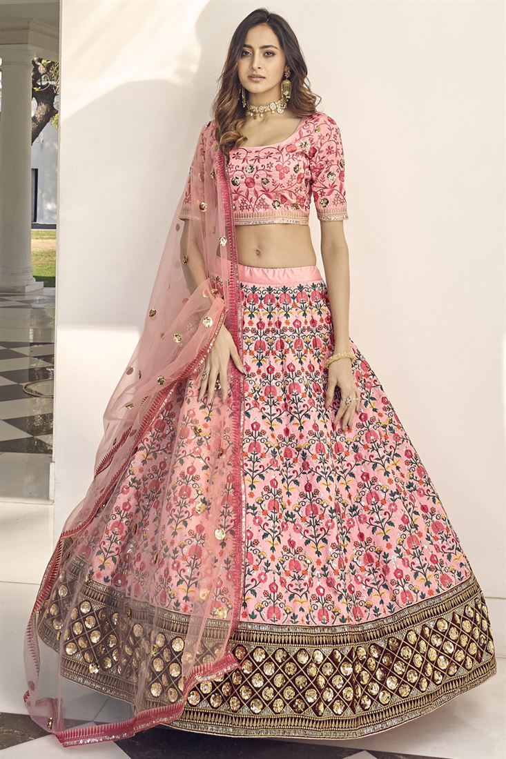 टेक्स्ट ब्लॉक आकर्षक आर्ट सिल्क फैब्रिक गुलाबी रंग का संगीत वियर लहंगा कढ़ाई के काम के साथ