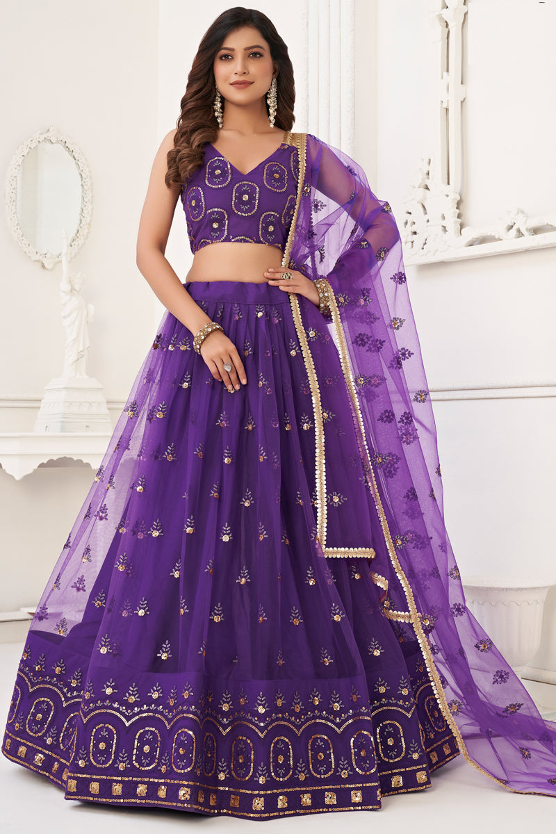 टेक्स्ट ब्लॉक नेट फैब्रिक पर बहुत बढ़िया कढ़ाई का काम बैंगनी रंग का लहंगा चोली