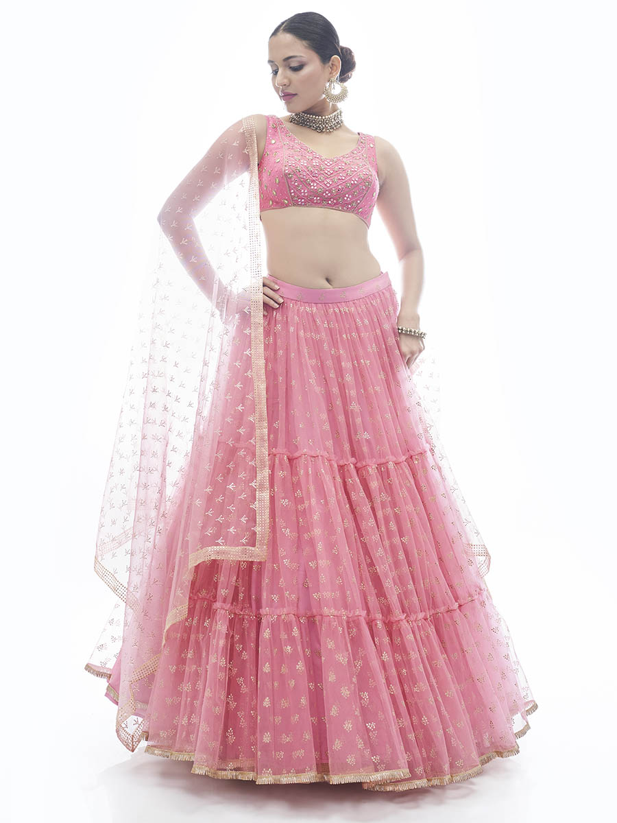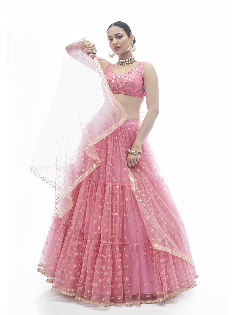 बेबी पिंक आर्ट सिल्क डिज़ाइनर लहंगा में आर्ट सिल्क ब्लाउज़ और सॉफ्ट नेट लहंगा के साथ चिनॉन दुपट्टा है। कढ़ाई धागे, जरी और सेक्विन के साथ पूरी की जाती है। यह स्टाइल भारत में बना है और उच्च गुणवत्ता सुनिश्चित करने के लिए हाथ से जाँच की जाती है।