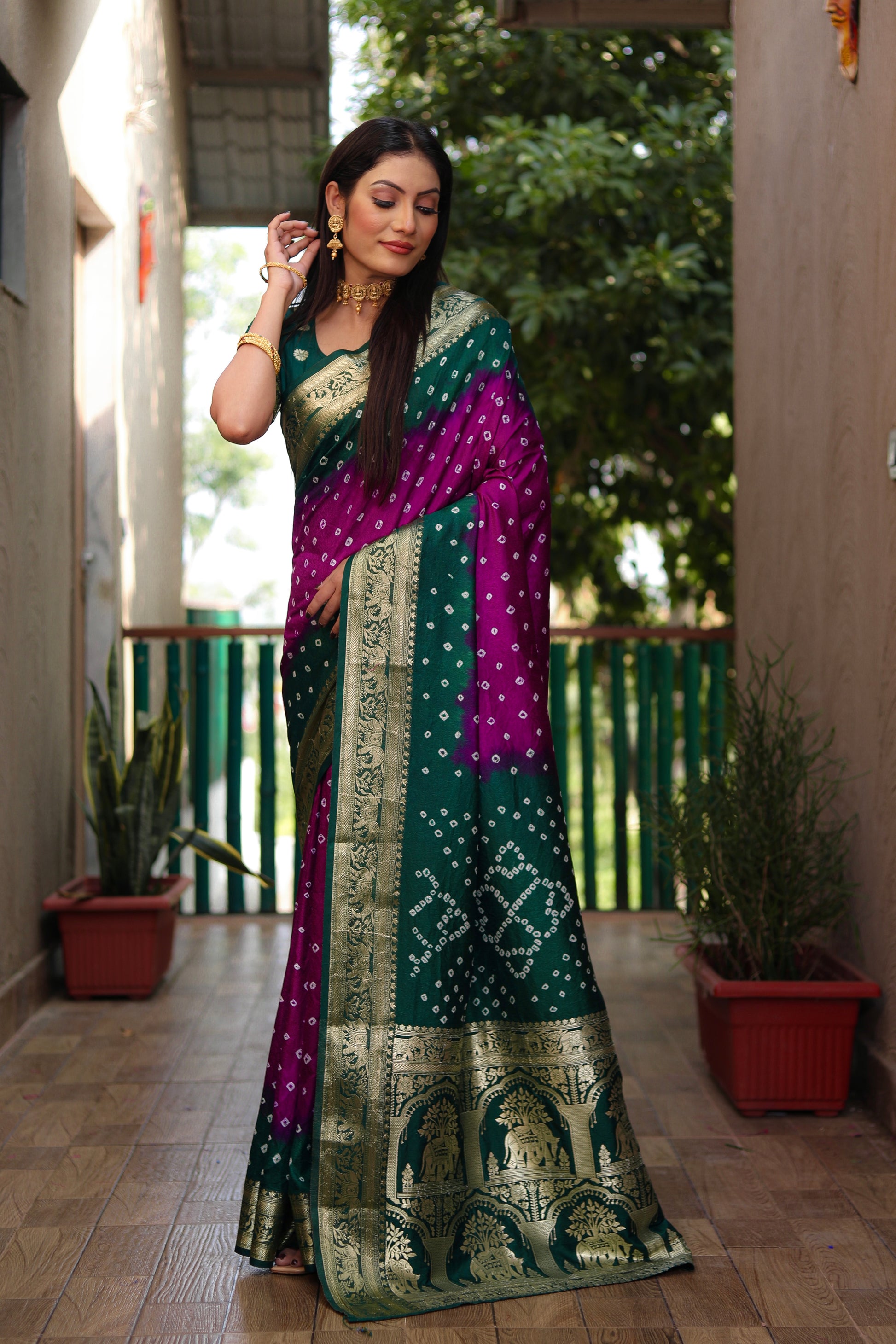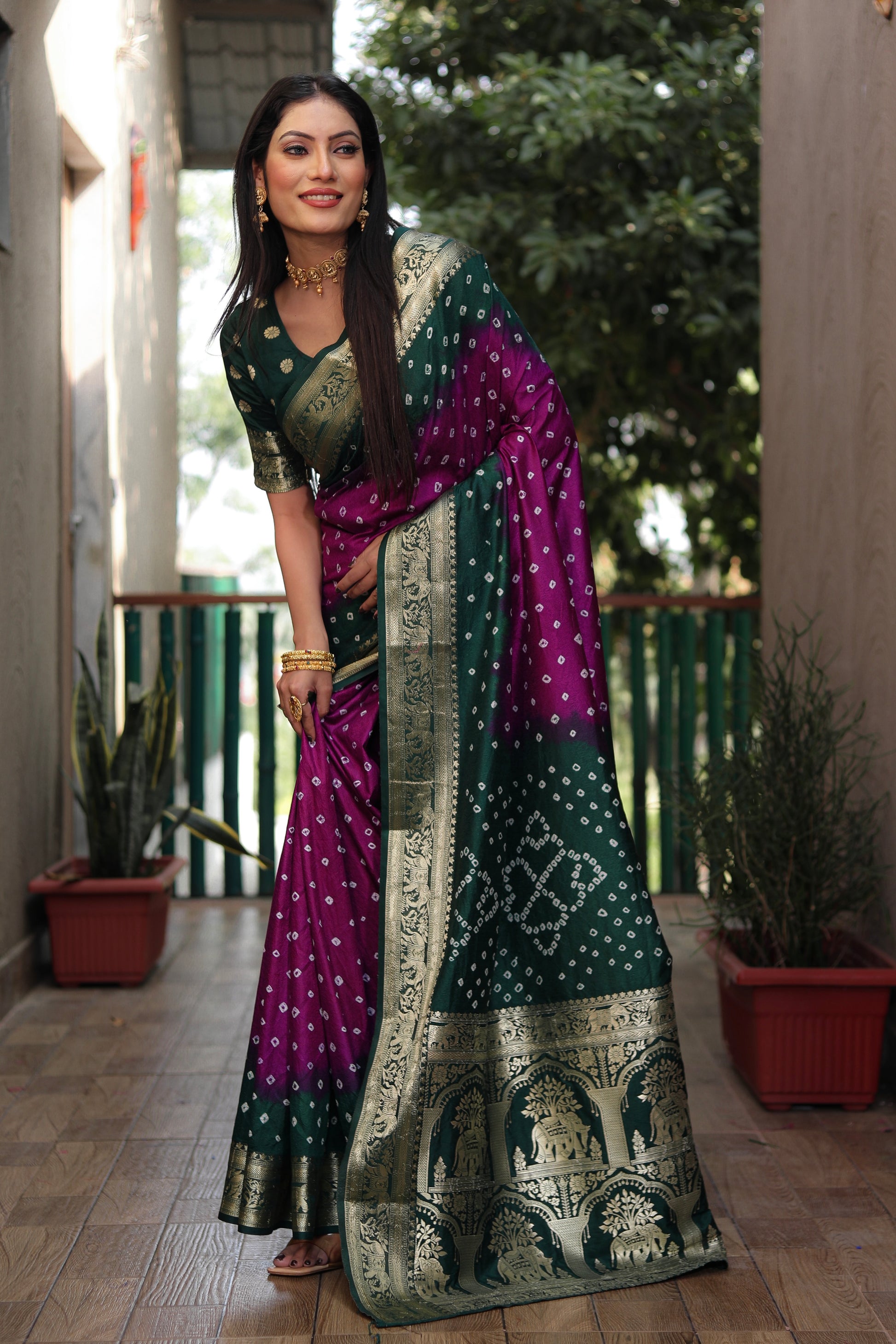 ज़री बॉर्डर रिच टिश्यू पल्लू के साथ बंधेज बॉर्डर वाली पर्पल वाहिनी बंधेज सिल्क साड़ी