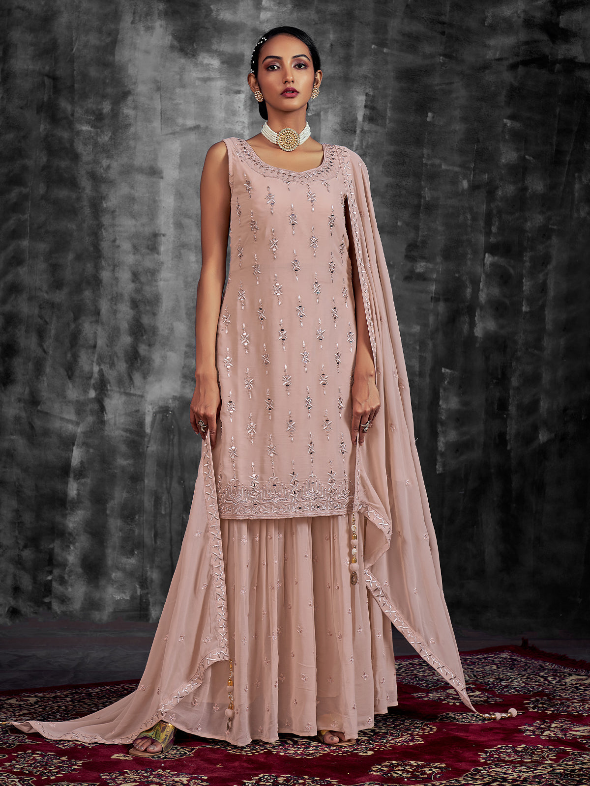 सुंदर कढ़ाईदार पीच जॉर्जेट सिले कुर्ता सेट