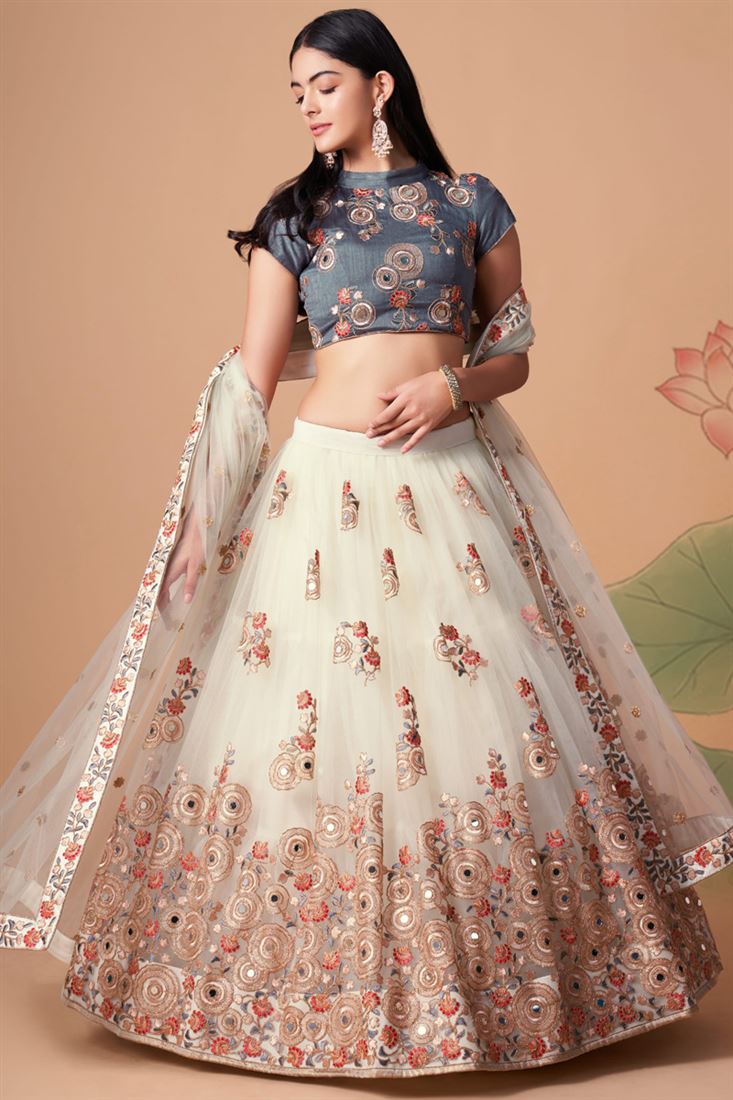 आकर्षक संगीत वियर ऑफ व्हाइट कलर नेट फैब्रिक लहंगा चोली