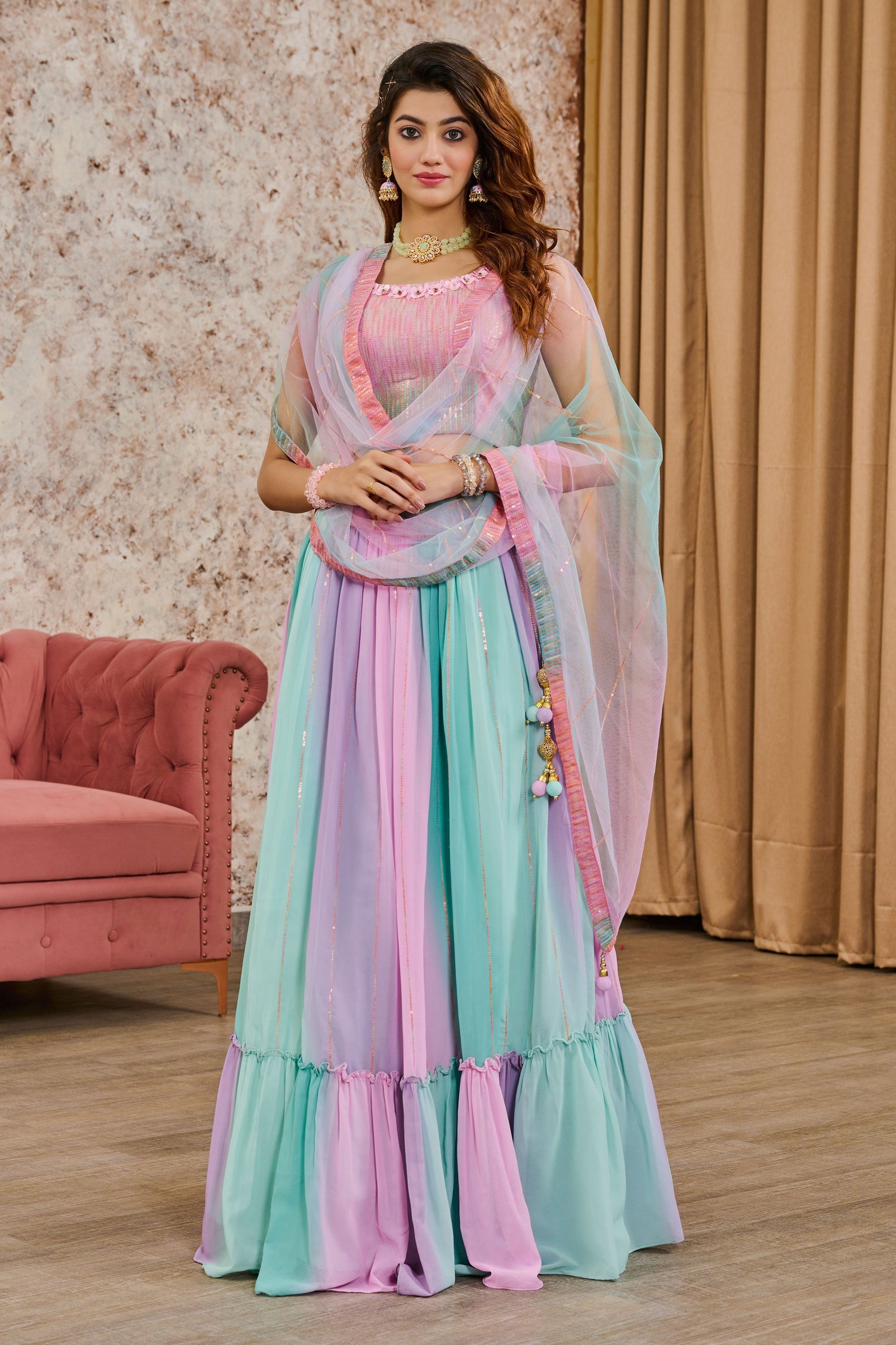 मल्टी कलर जॉर्जेट फैब्रिक रेडीमेड लहंगा पर आकर्षक सेक्विन वर्क