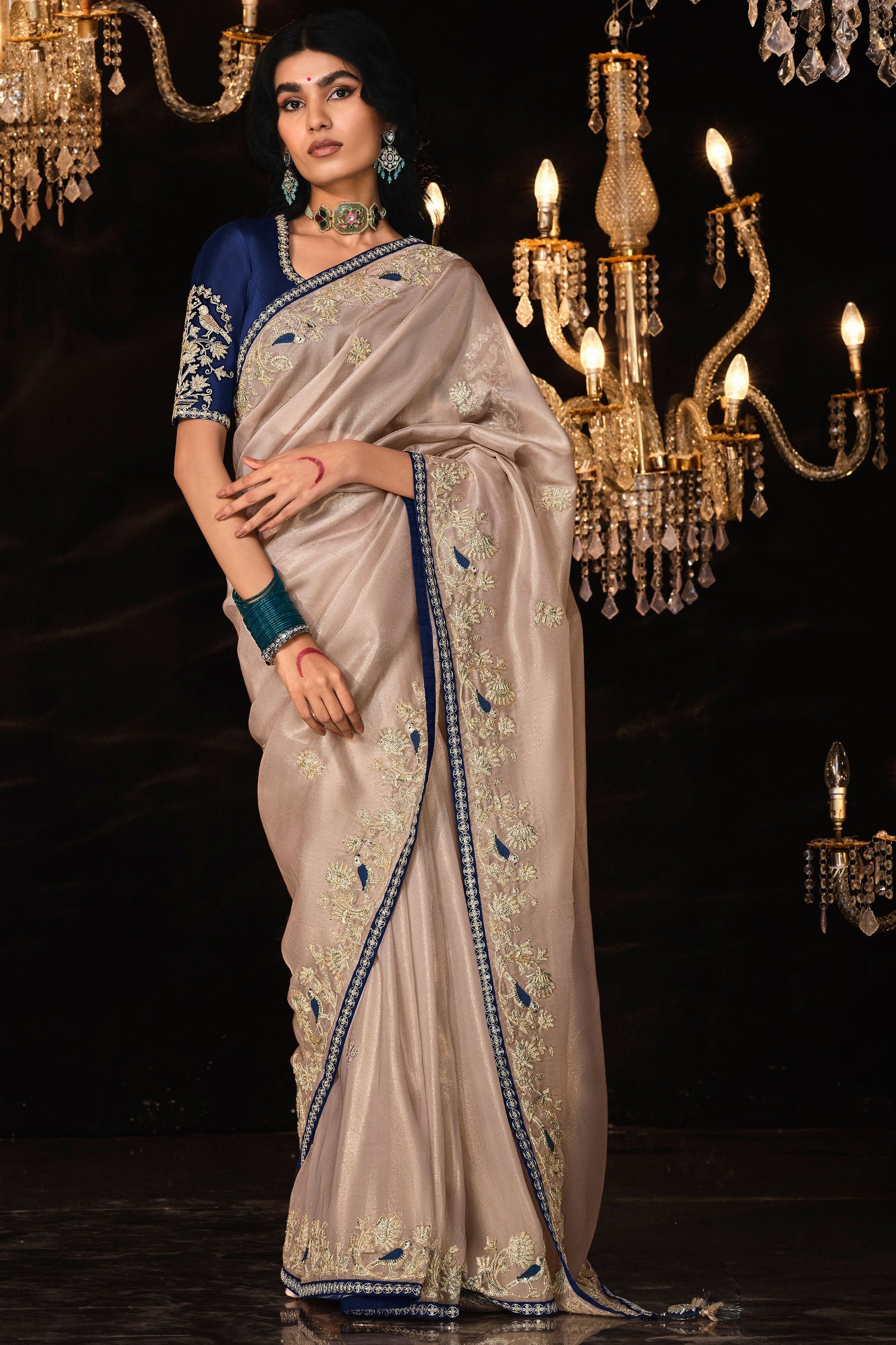 कढ़ाई के काम के साथ बेज रंग की फैंसी फैब्रिक वाली साड़ी