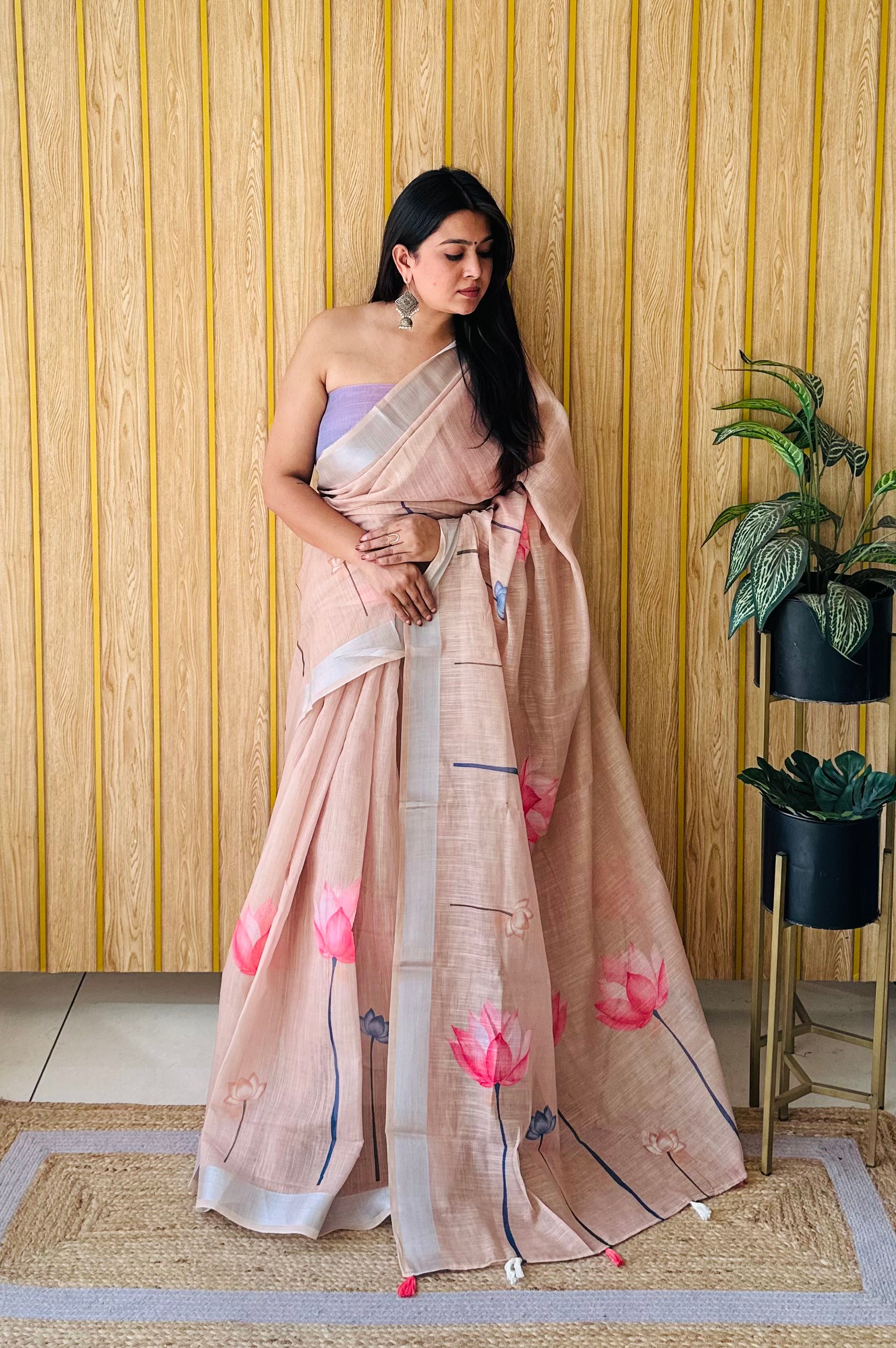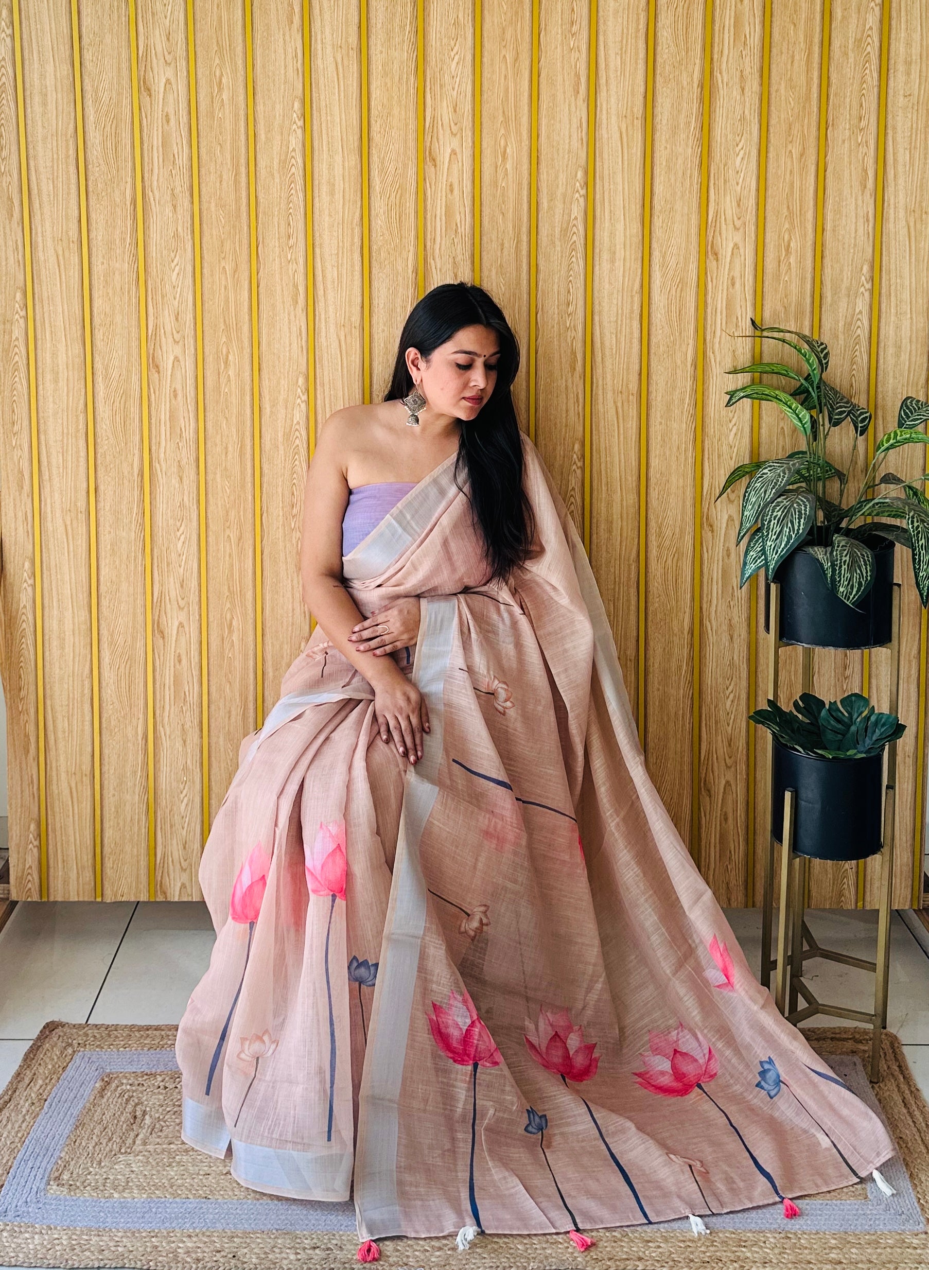 बेज रंग प्रीमियम गुणवत्ता नरम लिनन कपास डिजिटल प्रिंट साड़ी चांदी सीमा के साथ