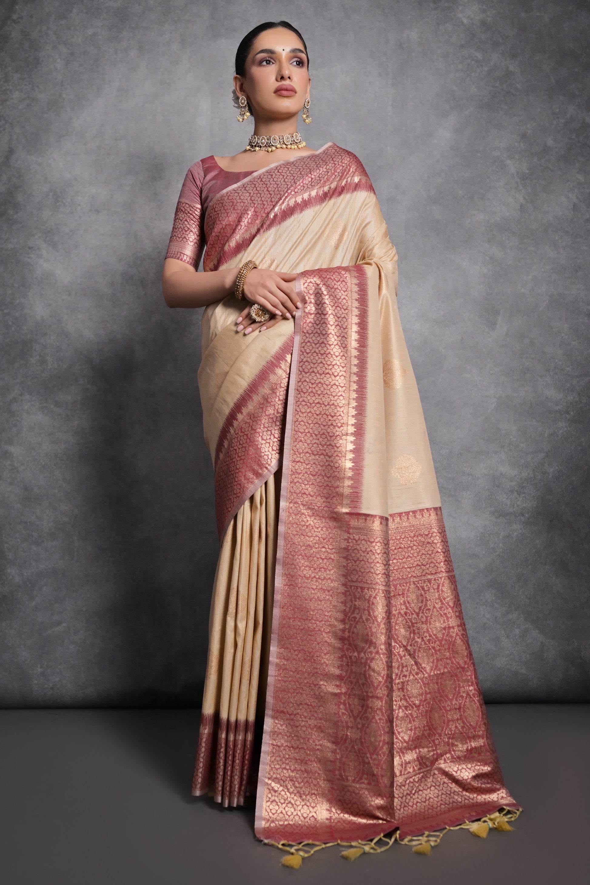 बेज रंग की ज़री बुनाई बॉर्डर वर्क डिज़ाइनर टसर सिल्क साड़ी