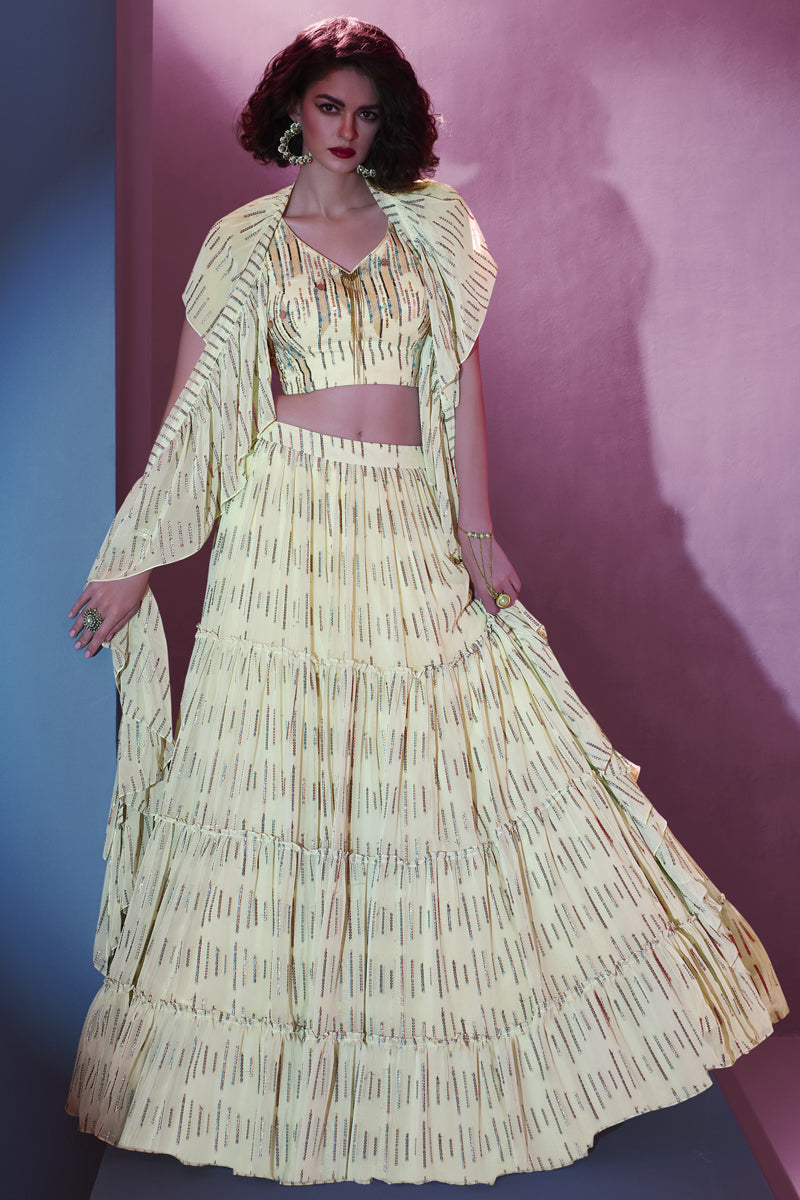 टेक्स्ट ब्लॉक बेज ऑन आर्ट सिल्क संगीत वियर रेडीमेड लहंगा चोली सुंदर ब्लाउज के साथ