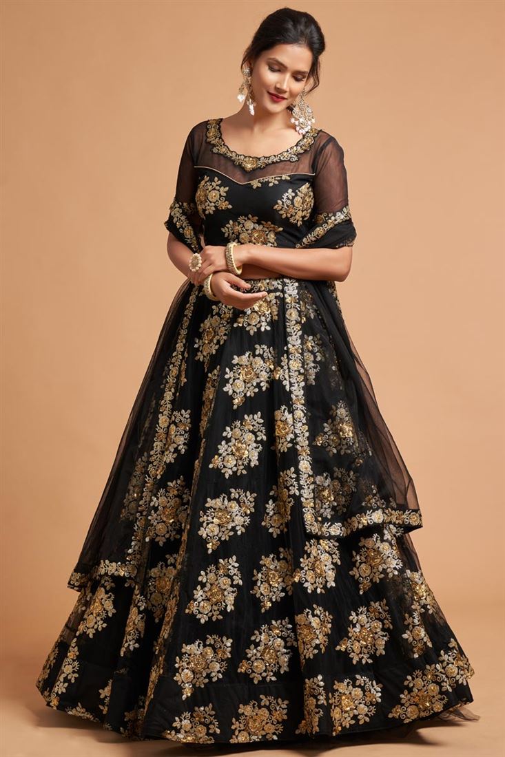 काले रंग का आकर्षक नेट फैब्रिक संगीत वियर लहंगा कढ़ाई के काम के साथ