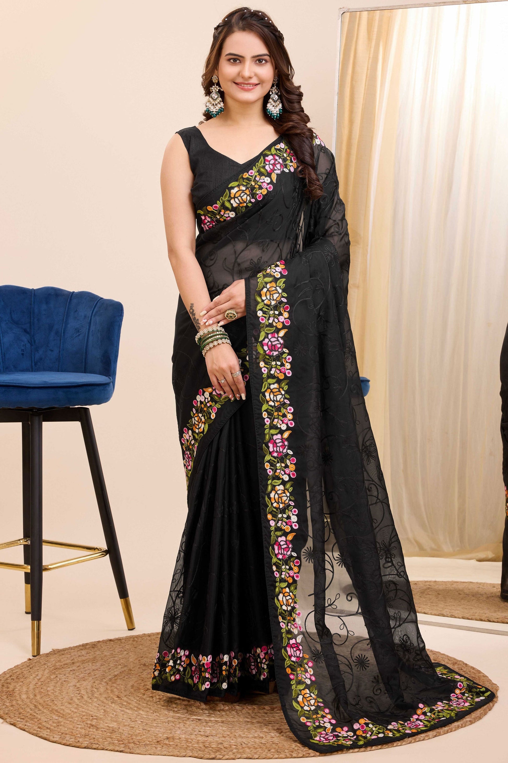 काले रंग की उत्तम कढ़ाई वाला त्यौहारी पहनावा आर्ट सिल्क साड़ी