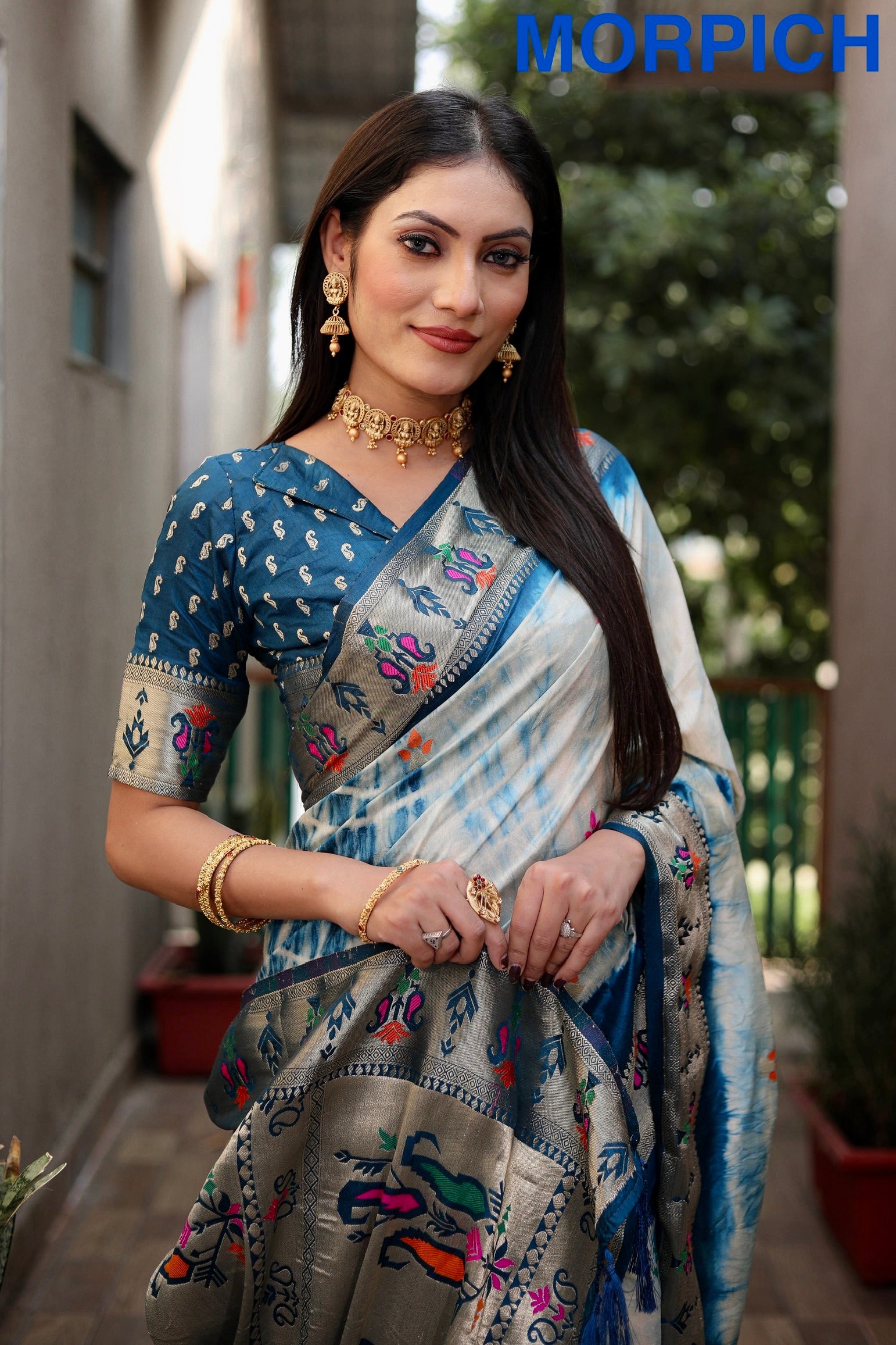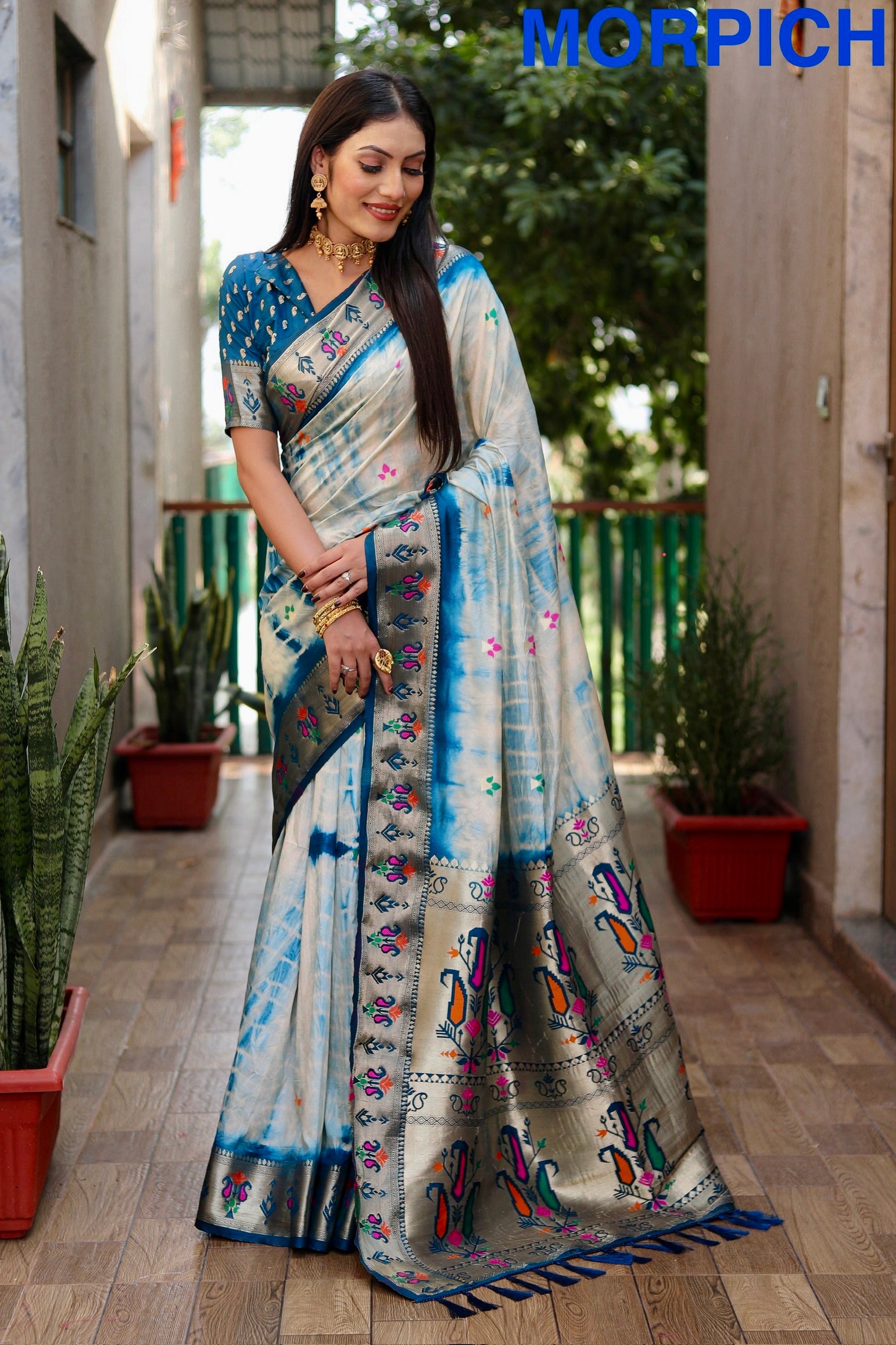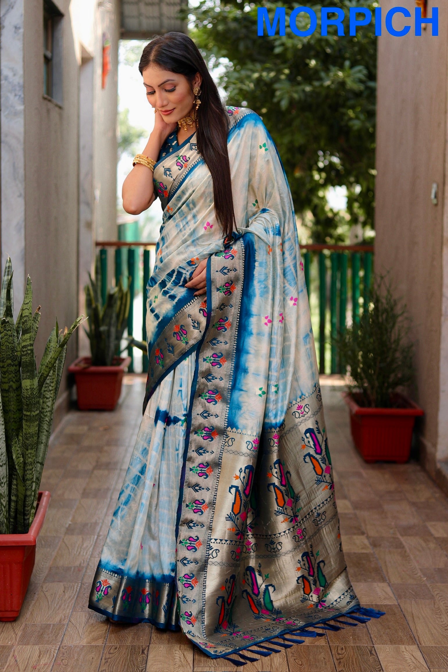साड़ी का फ़ैब्रिक: सिबोरी प्रिंट पैठनी सिल्क साड़ी ज़री गोल्ड और मीनाकारी पैठानी बॉर्डर और कंट्रास्ट बुनाई रिच पल्लू के साथ