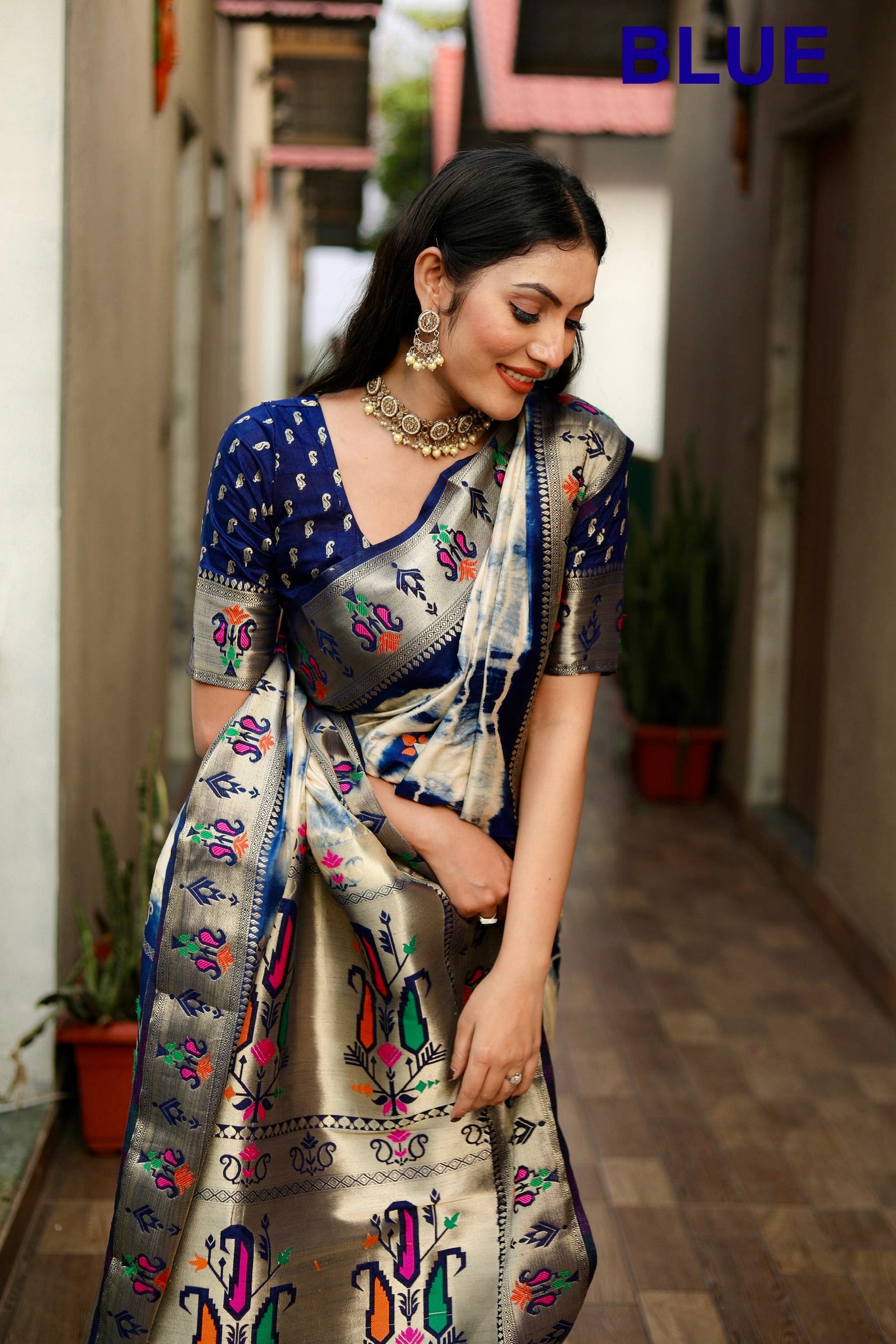 नीले रंग की विशेष सिबरी प्रिंट पैथानी सिल्क साड़ी ज़री गोल्ड और मीनाकारी पैथानी बॉर्डर