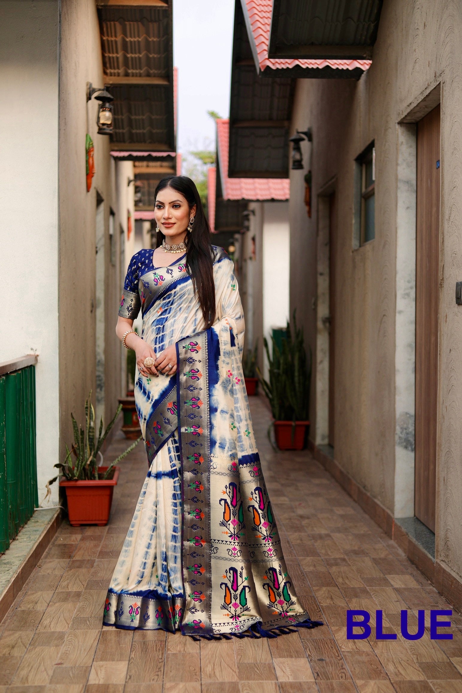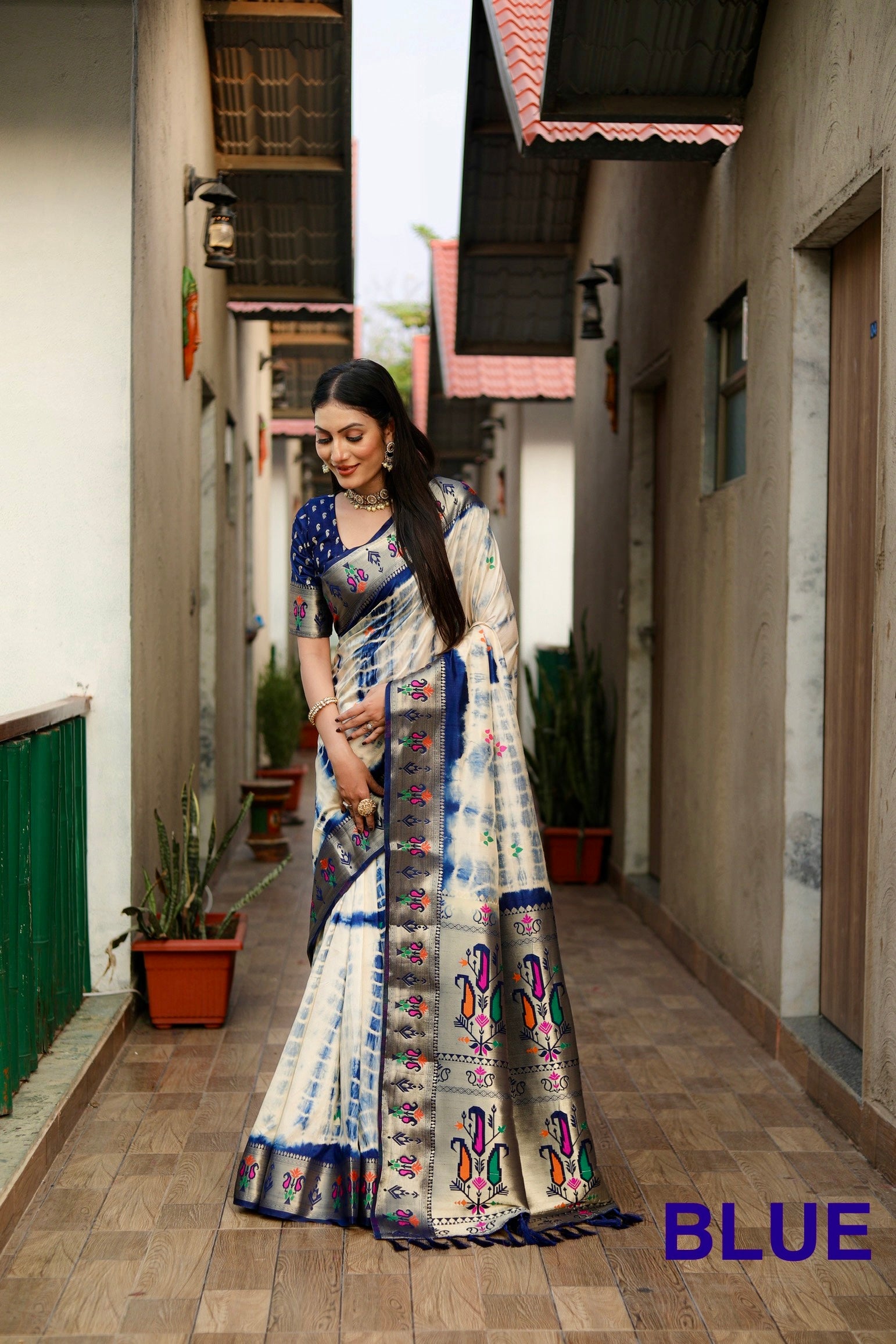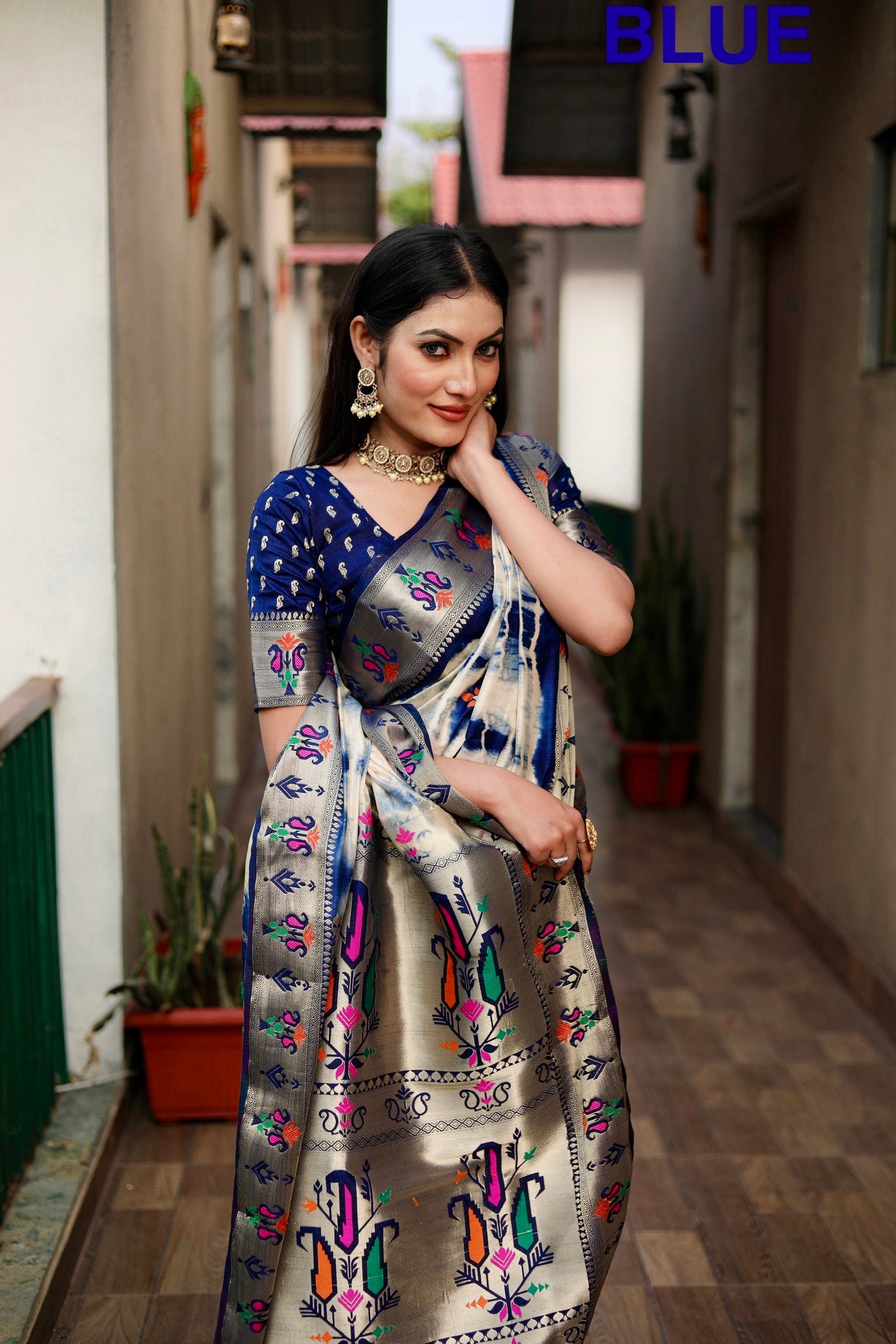 साड़ी का फ़ैब्रिक: सिबोरी प्रिंट पैठनी सिल्क साड़ी ज़री गोल्ड और मीनाकारी पैठानी बॉर्डर और कंट्रास्ट बुनाई रिच पल्लू के साथ