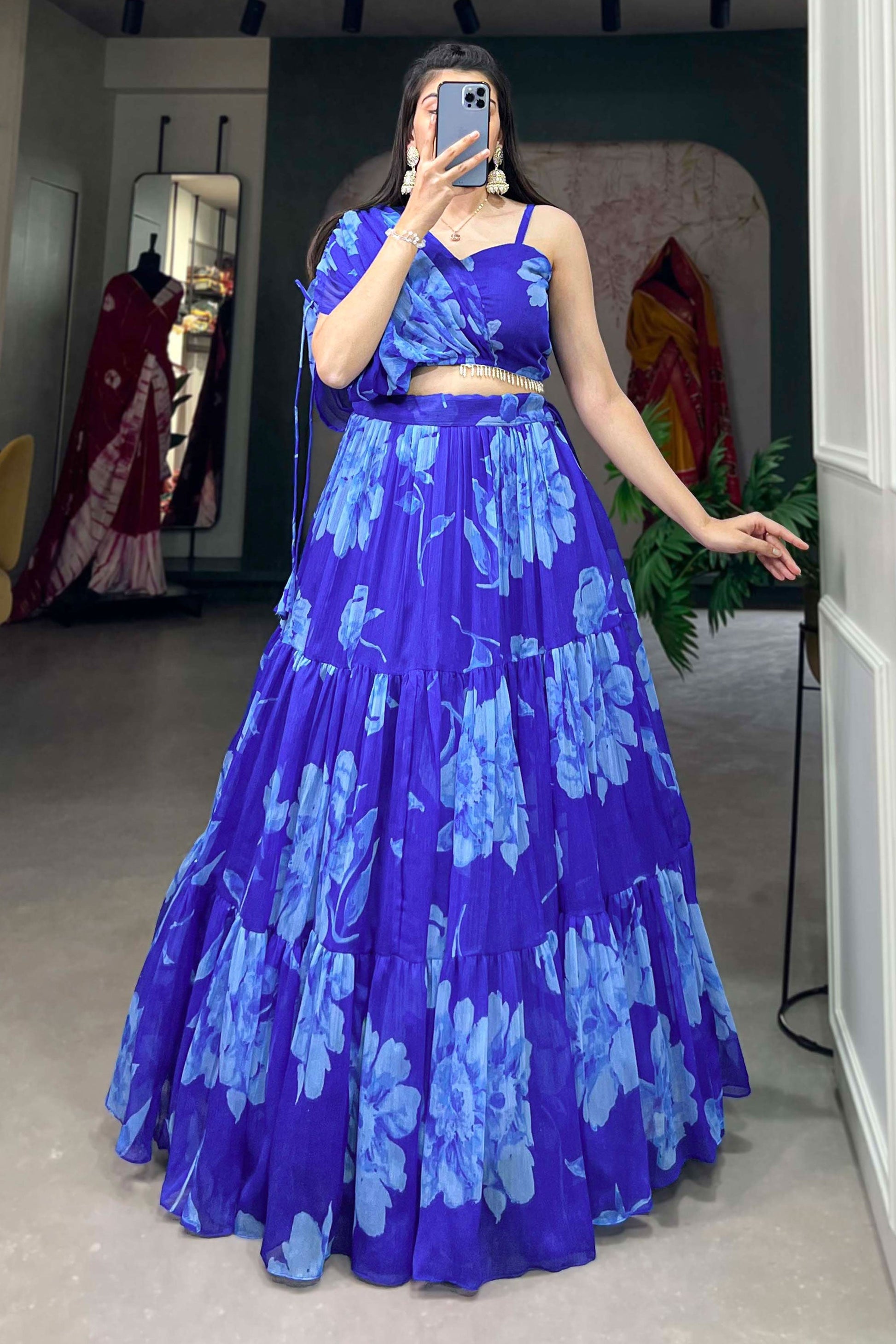 शिफॉन फैब्रिक में नीले रंग का फ्लोरल प्रिंटेड वर्क चमकदार रेडीमेड लहंगा
