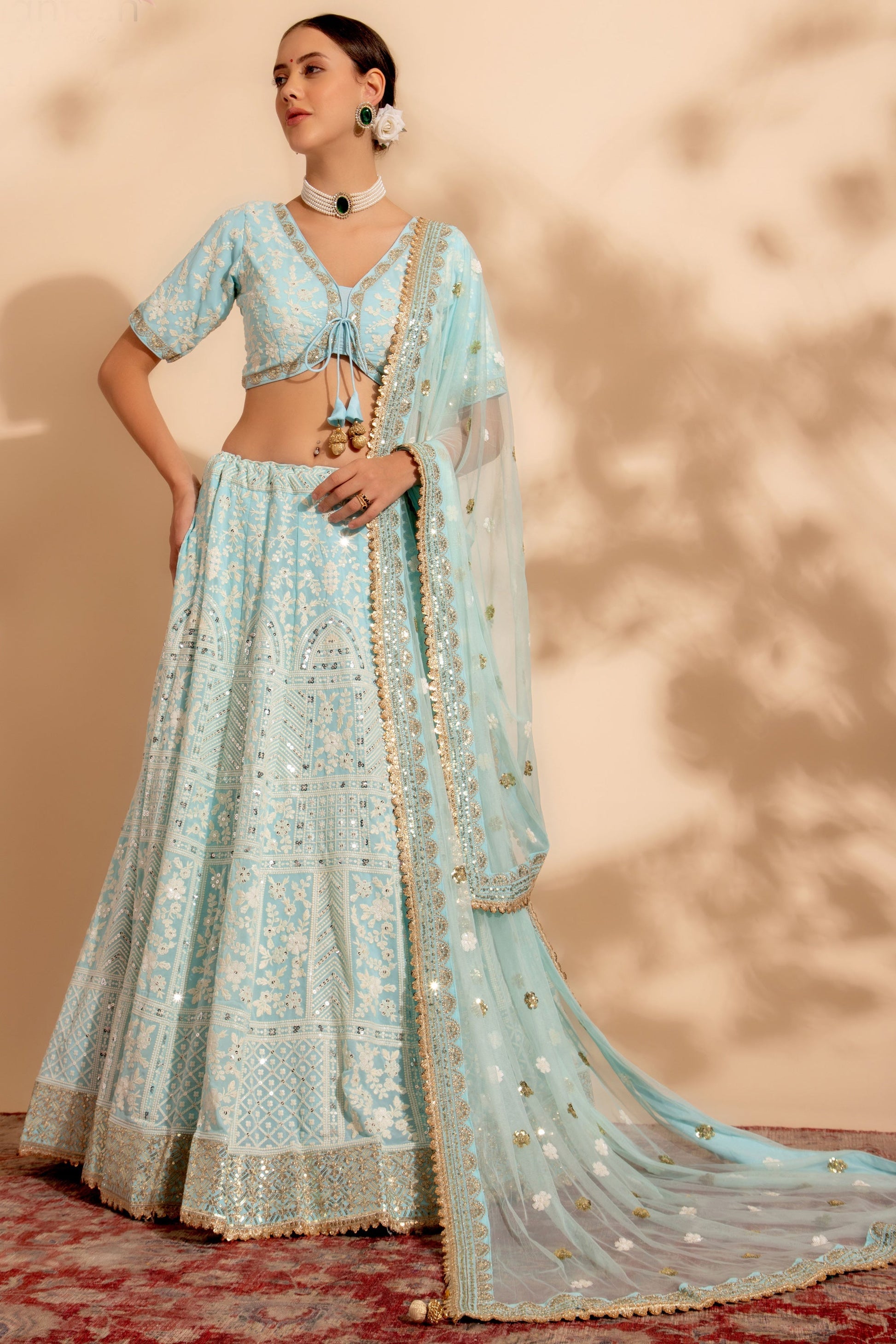 जॉर्जेट फैब्रिक पर नीले रंग के सेक्विन वर्क से सजा खूबसूरत लहंगा