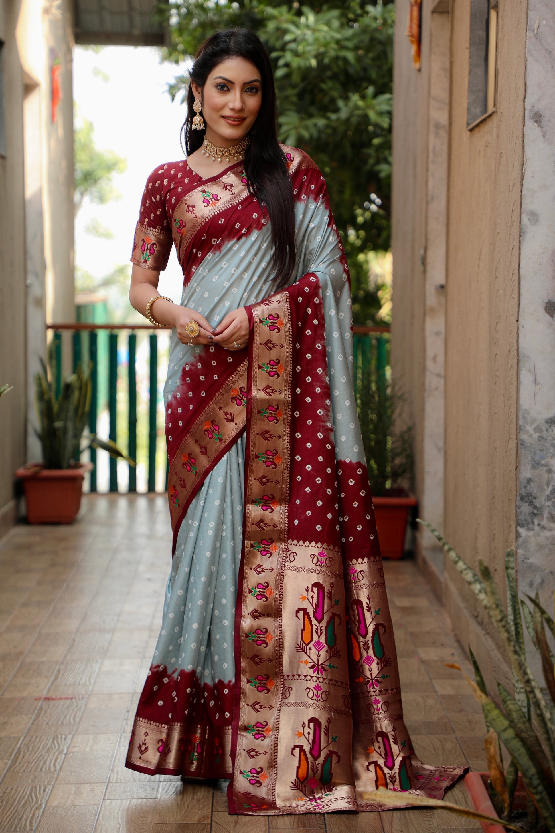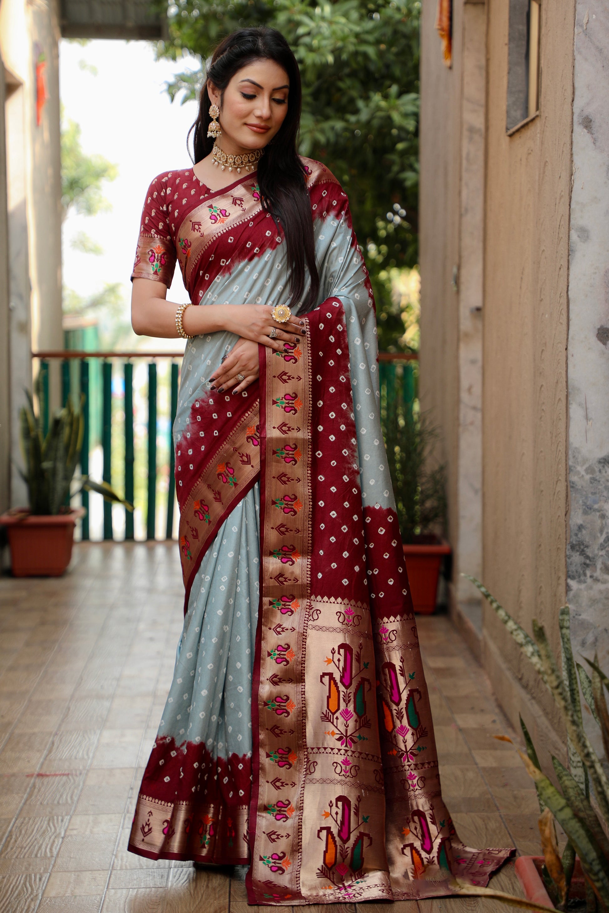 जरी पैठानी बुनाई बॉर्डर के साथ ग्रे चांदनी डोला नरम रेशम बंधेज साड़ी
