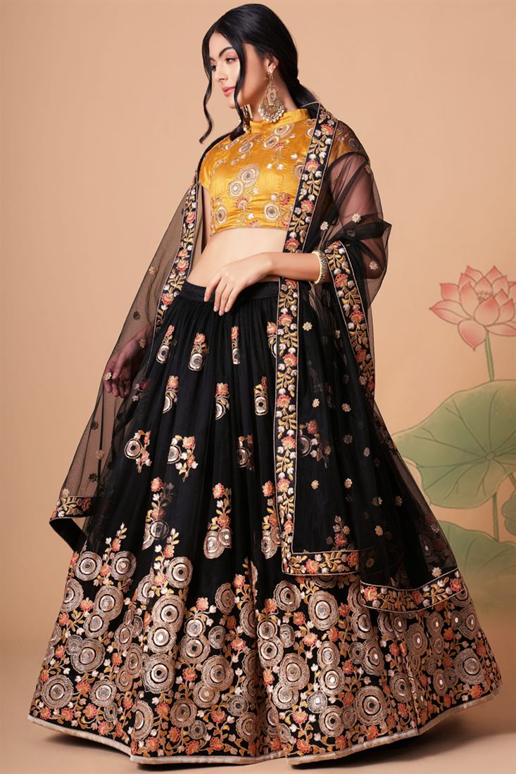 टेक्स्ट ब्लॉक संगीत वियर में आकर्षक ब्लैक कलर नेट फैब्रिक लहंगा चोली