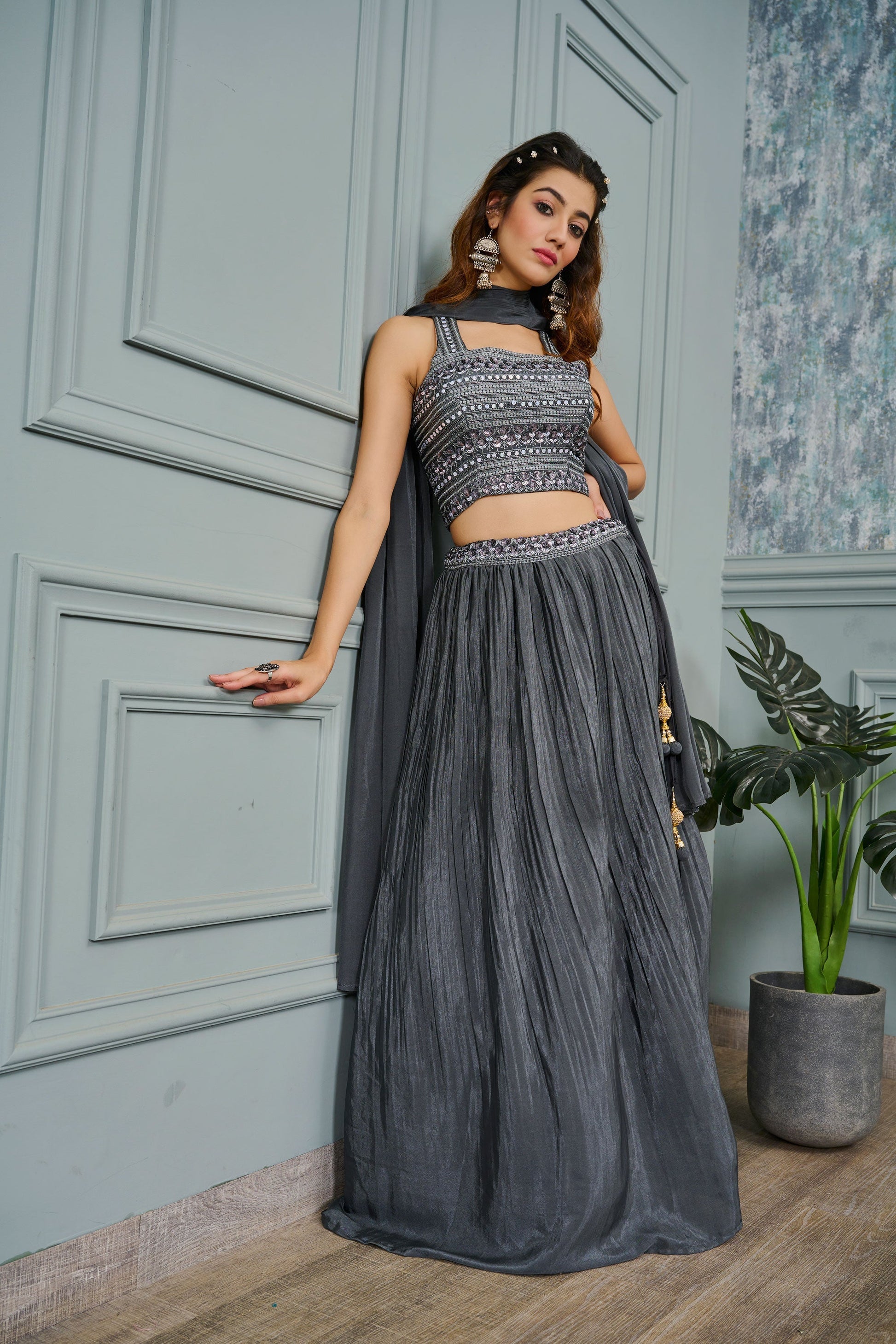 आकर्षक ग्रे कलर आर्ट सिल्क फैब्रिक रेडीमेड लहंगा सेक्विन वर्क के साथ
