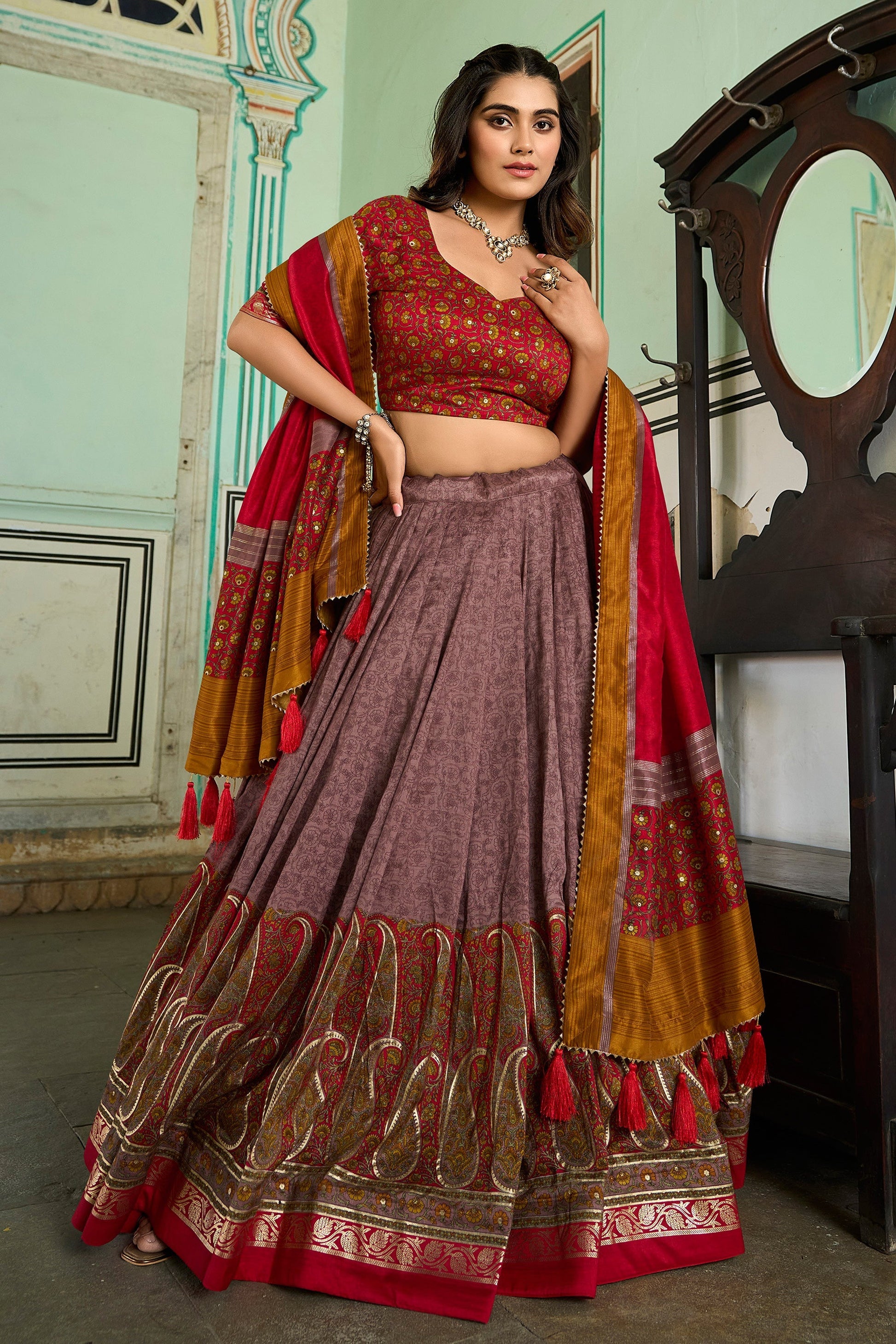 चीकू कलर आर्ट सिल्क फंक्शन वियर कश्मीरी प्रिंटेड खूबसूरत लहंगा चोली