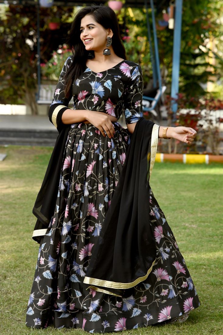 टेक्स्ट ब्लॉक चिनॉन फैब्रिक ब्लैक कलर विंसम प्रिंटेड लहंगा