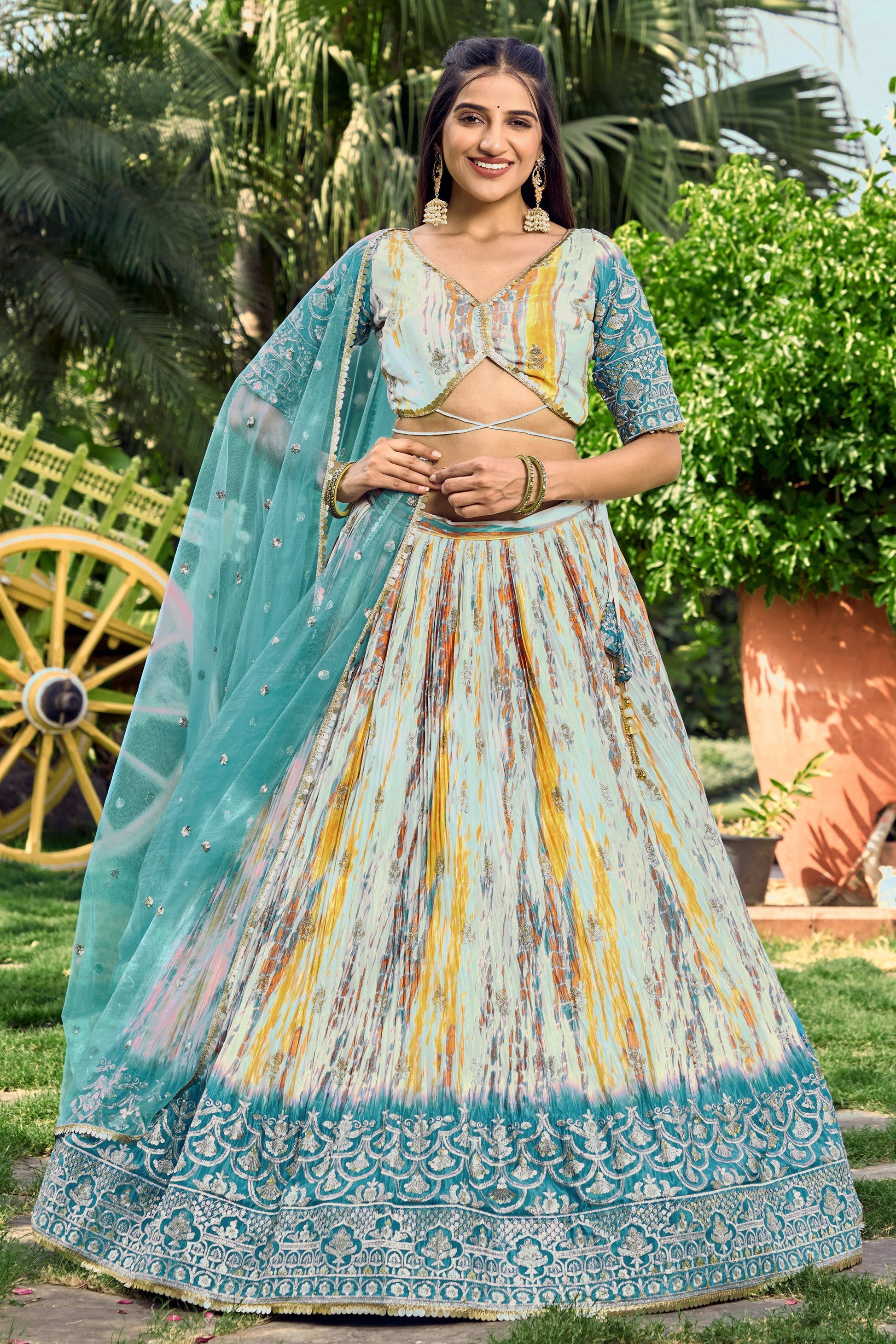 चिनॉन फ़ैब्रिक टील रंग एलिगेंट फंक्शन लुक सेक्विन डिज़ाइन लहंगा