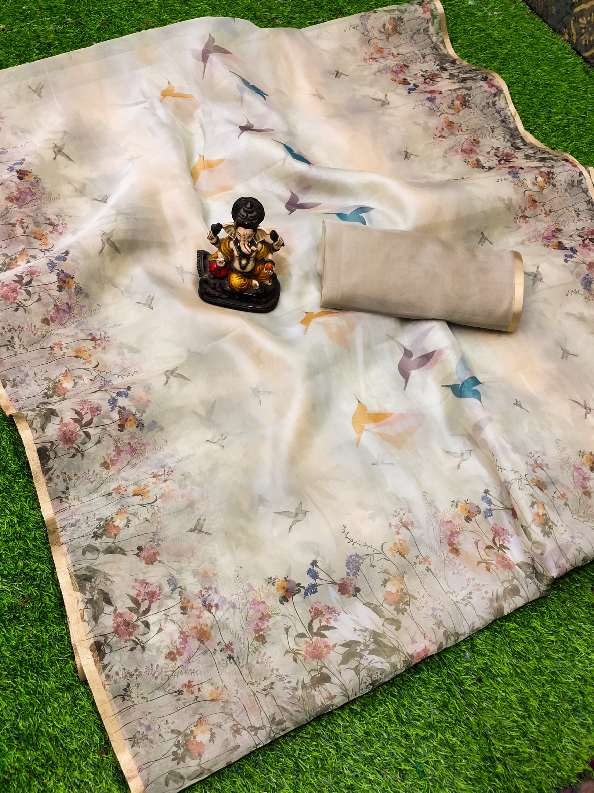 क्लासिक कलेक्शन बेस्ट ऑर्गेना डिजिटल प्रिंट सॉफ्ट चमकदार क्रीम रंग साड़ी के साथ