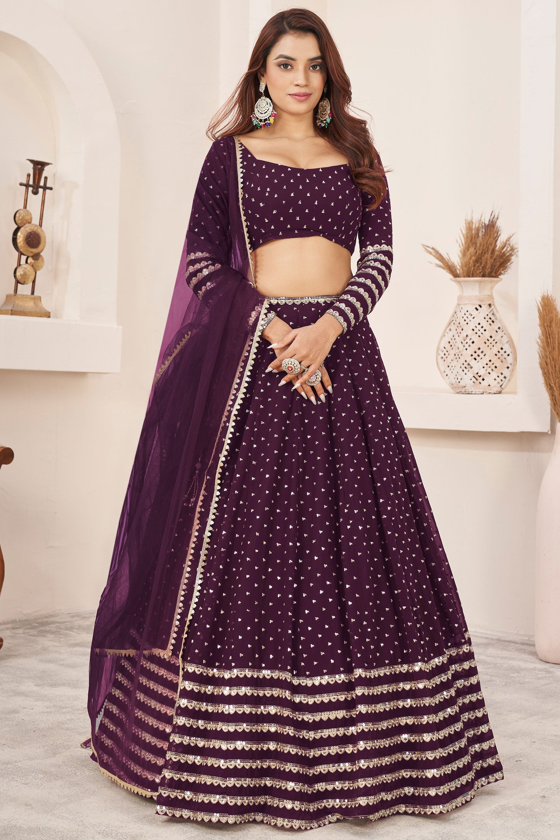 टेक्स्ट ब्लॉक फंक्शन के लिए क्लासिक जॉर्जेट सेक्विन डिज़ाइन वाइन कलर लेहेंगा चोली