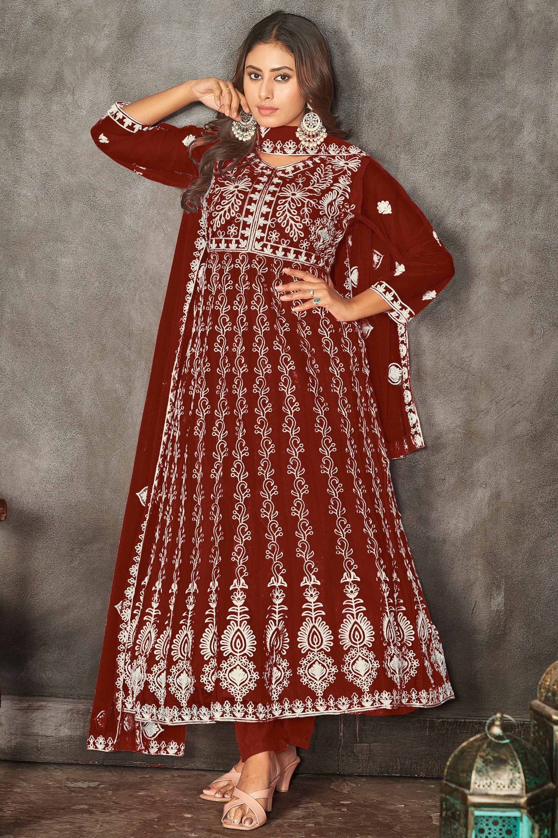 नेट फैब्रिक में क्लासिक मैरून रंग की कढ़ाई वाला अनारकली सूट