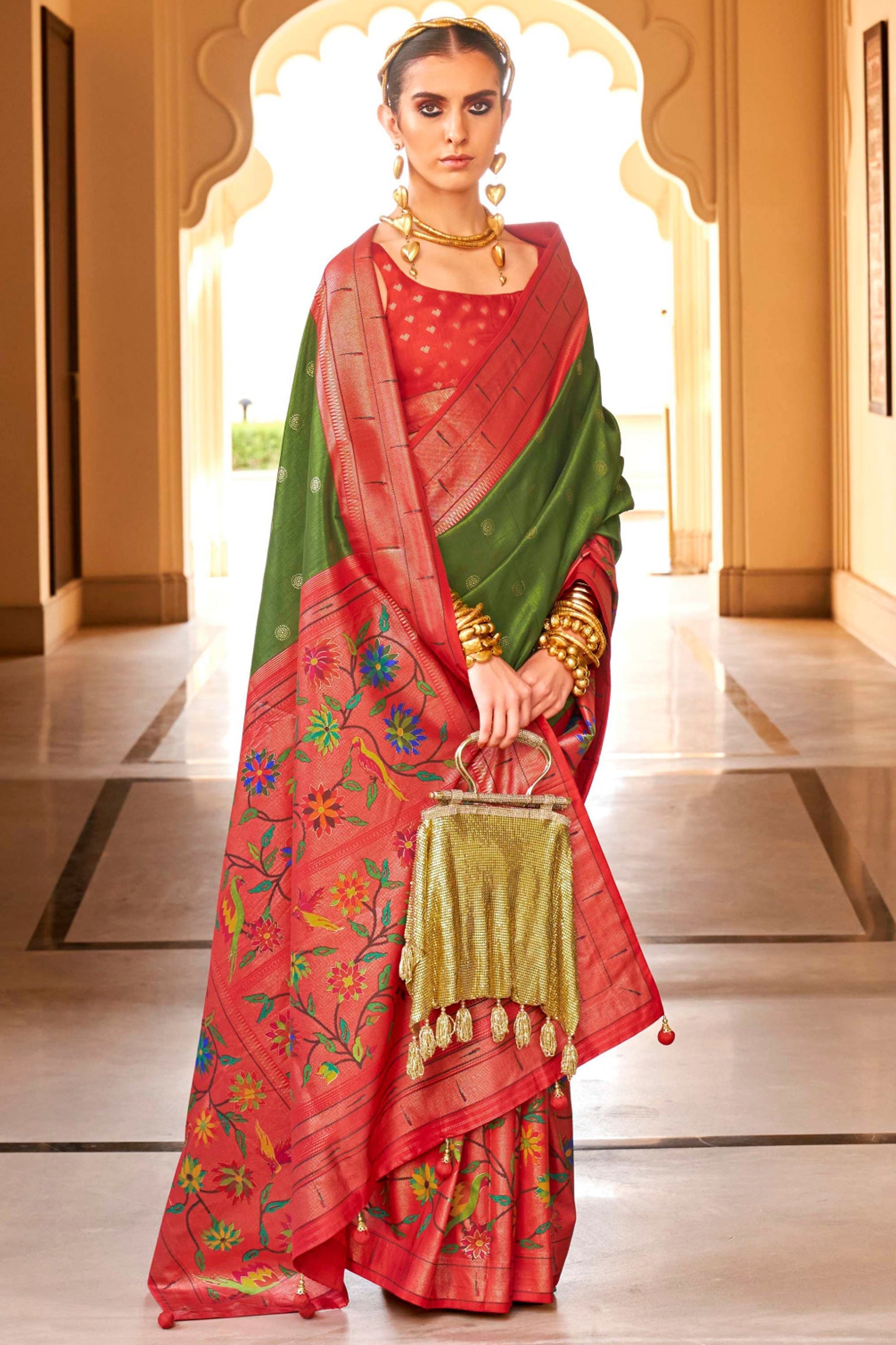 आर्ट सिल्क फैब्रिक में जैतून रंग की साड़ी पर क्लासिक पैठिनी मुद्रित डिजाइन