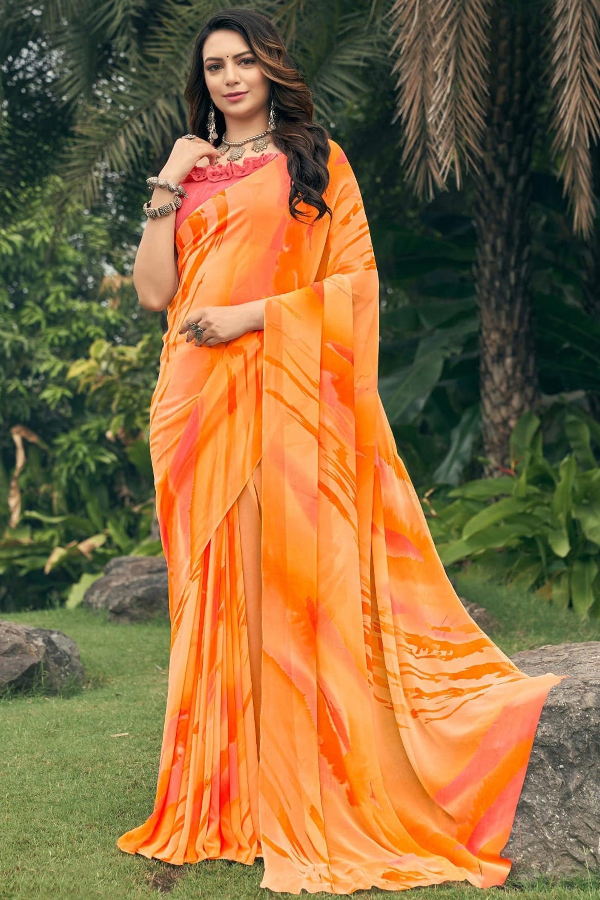 क्लासिक प्रिंटेड ऑरेंज कलर जॉर्जेट साड़ी