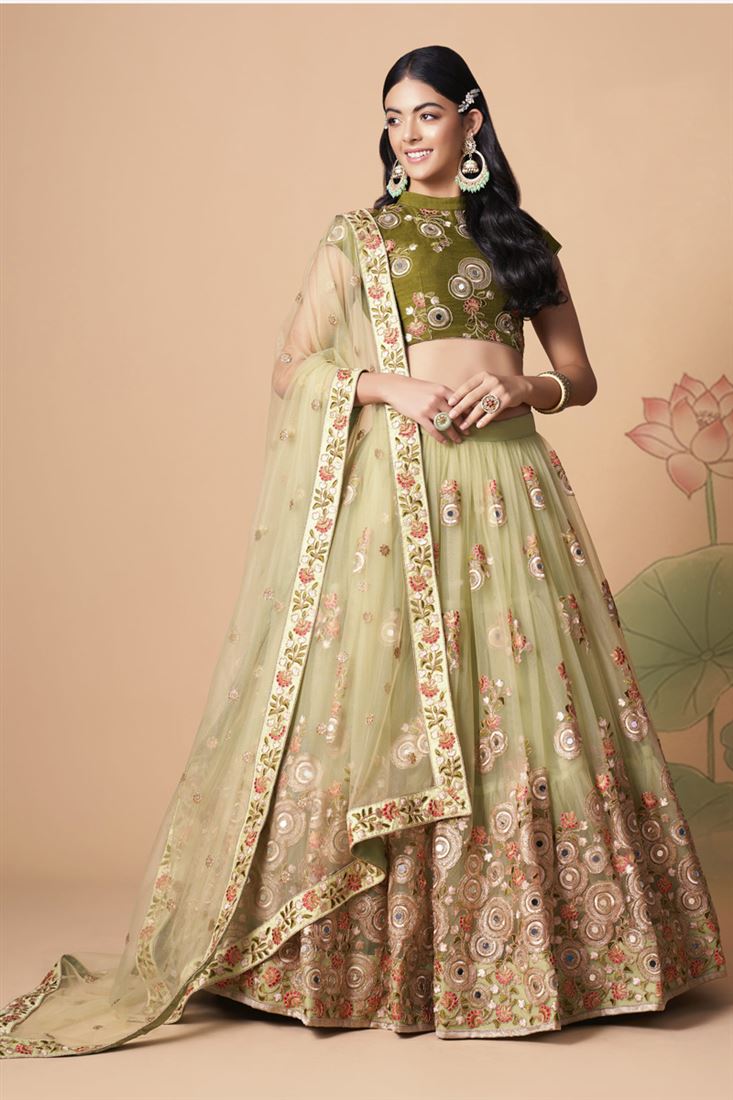 क्लासिक संगीत वियर बेज रंग का लेहंगा चोली नेट फैब्रिक में