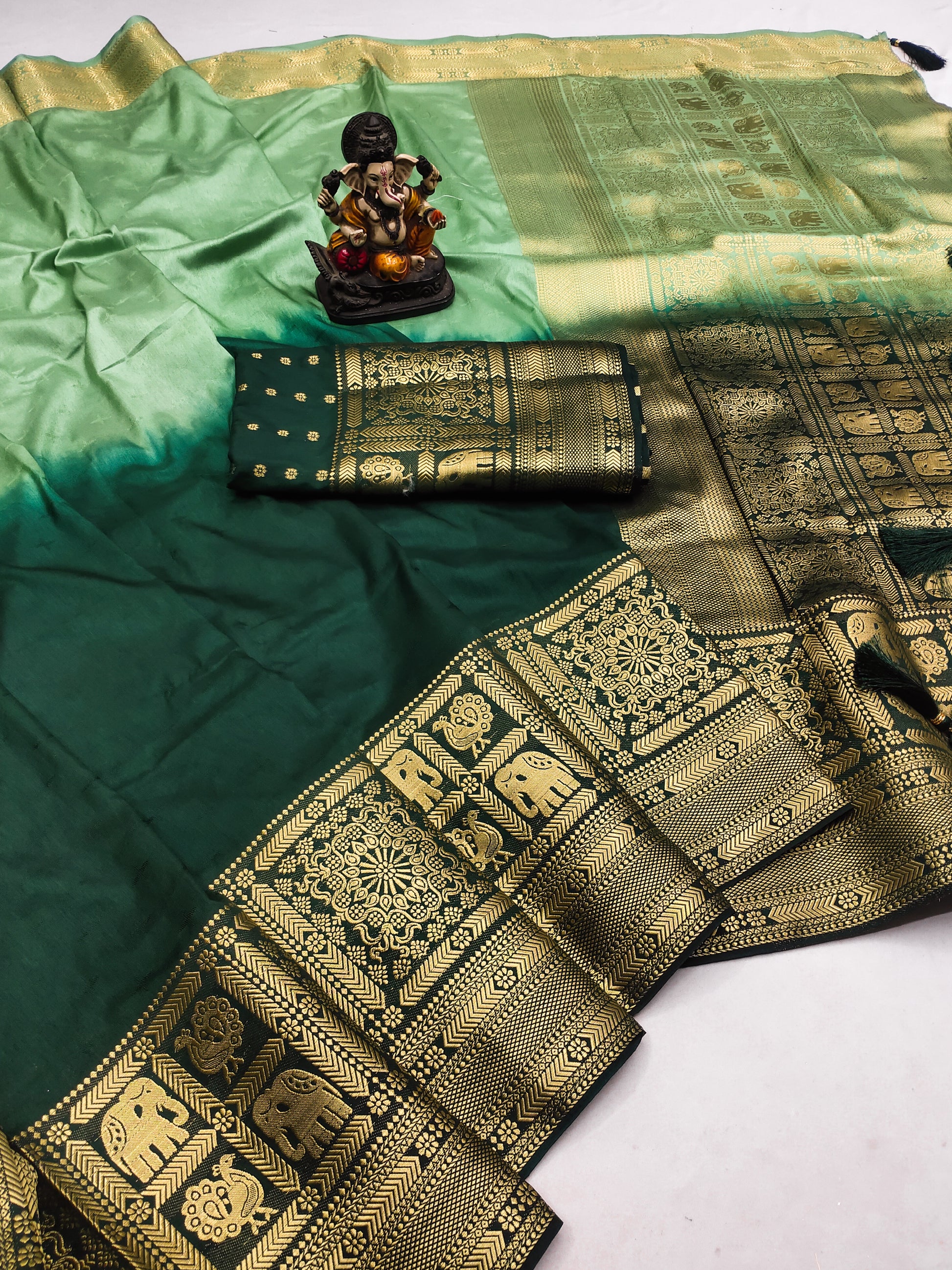 गहरे हरे रंग की सुपीरियर शुद्ध गाला डोला सिल्क साड़ी भारी हाथ से डाई और ज़री बॉर्डर