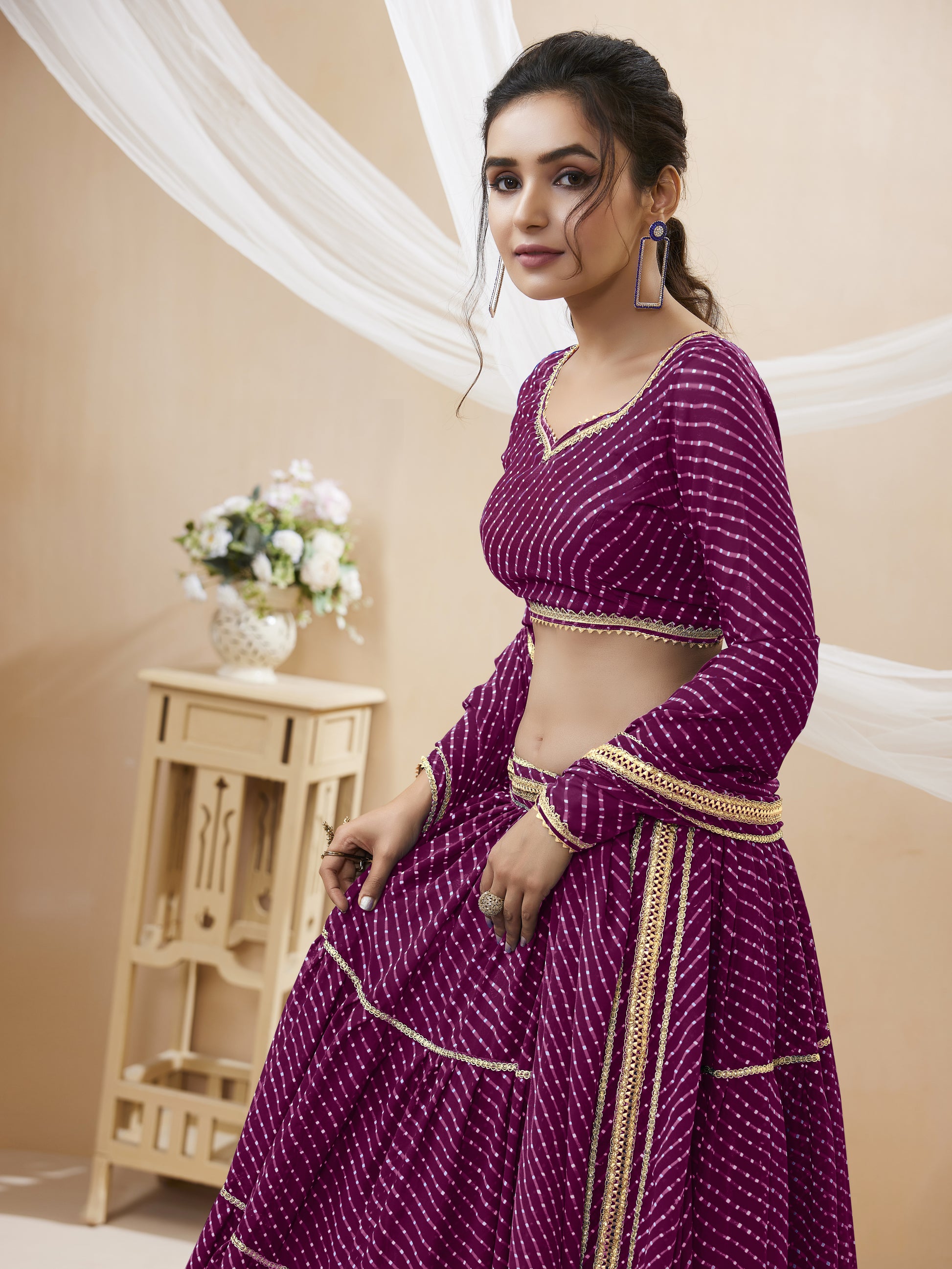 बैंगनी रंग का जॉर्जेट लहरिया प्रिंटेड लेस के साथ पूरे काम वाला लहंगा चोली