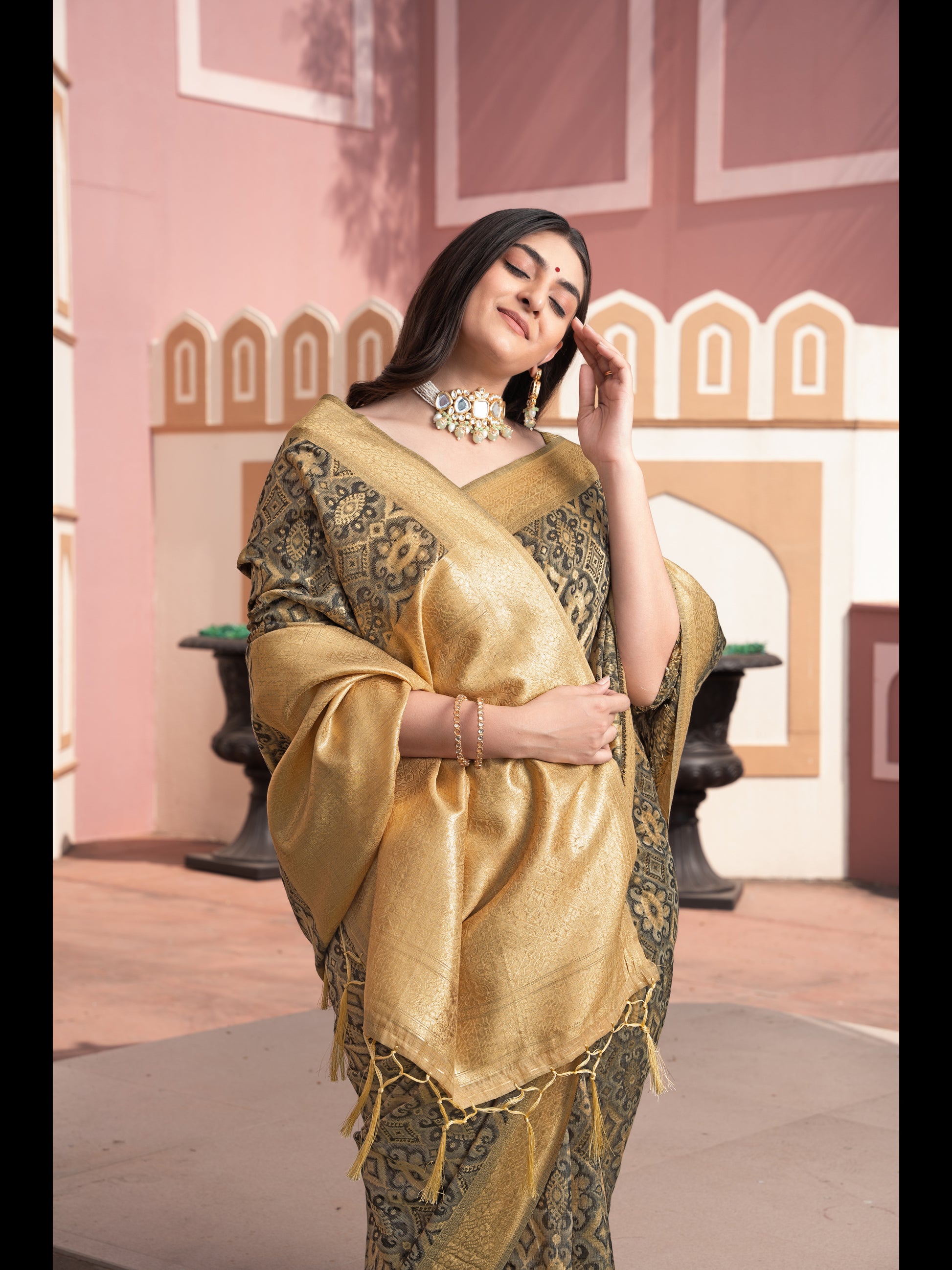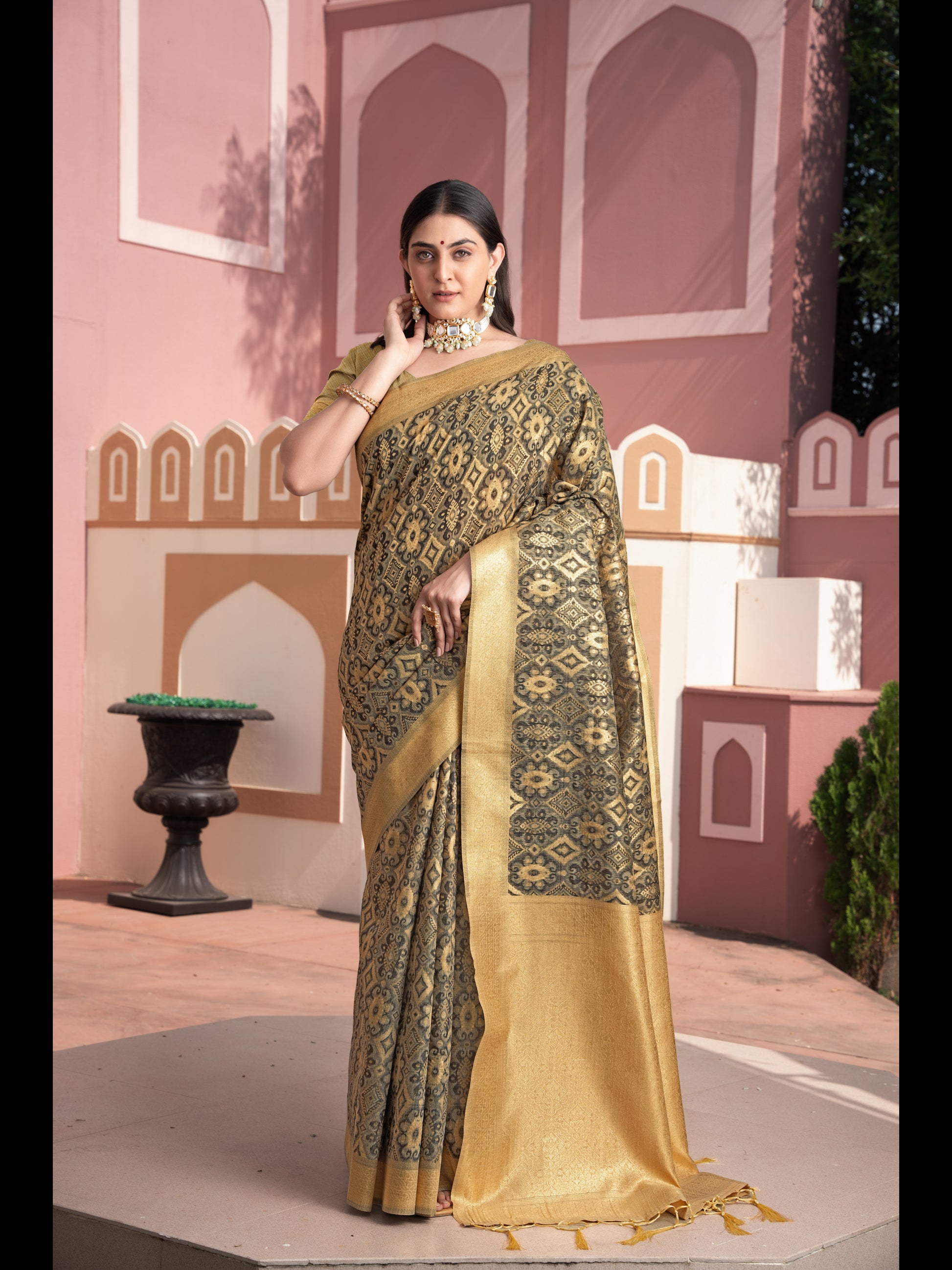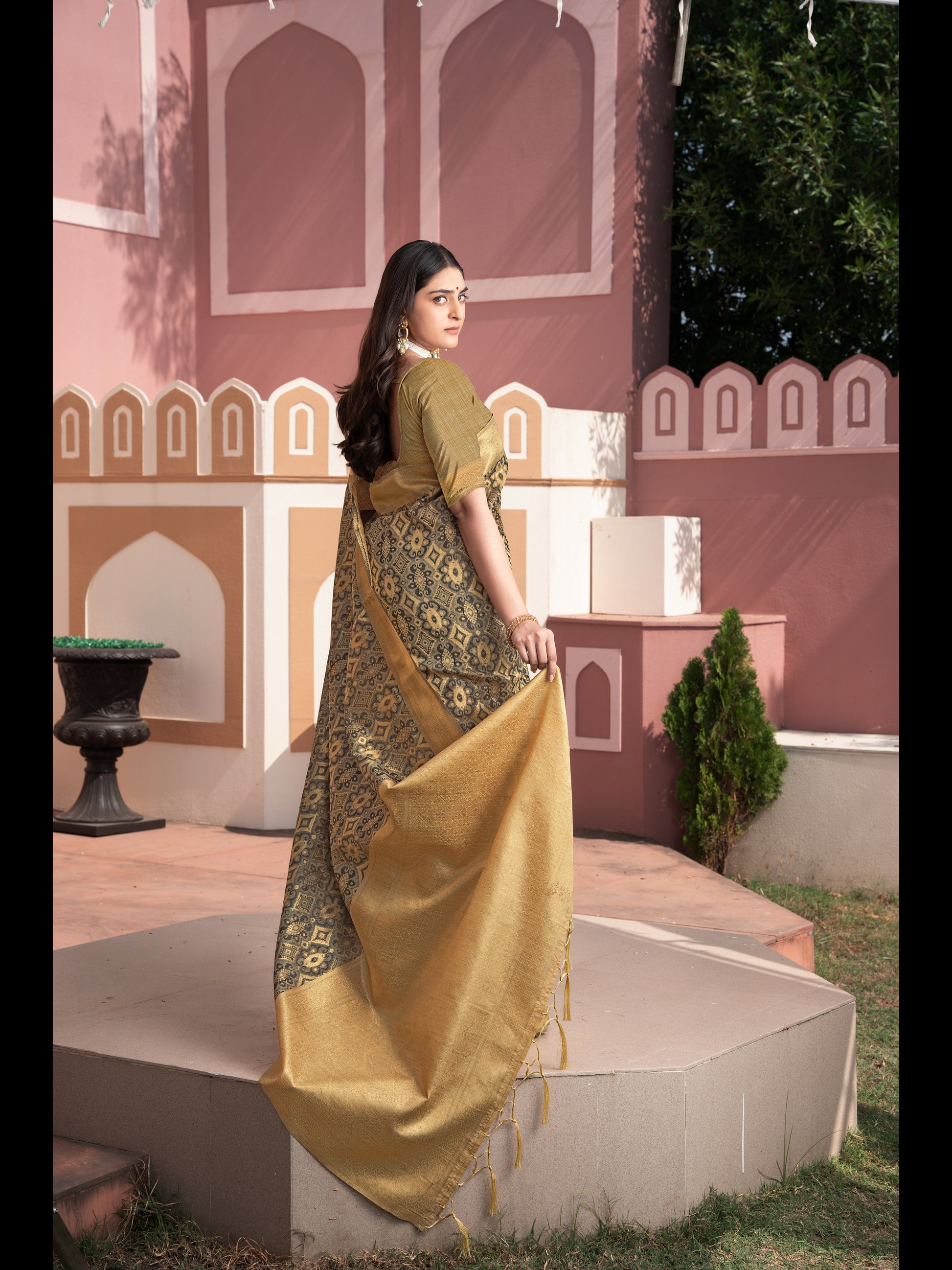 टेक्स्ट ब्लॉक भूरे रंग की इक्कत कॉटन इक्कत सिल्क साड़ी ज़री से बुनी हुई