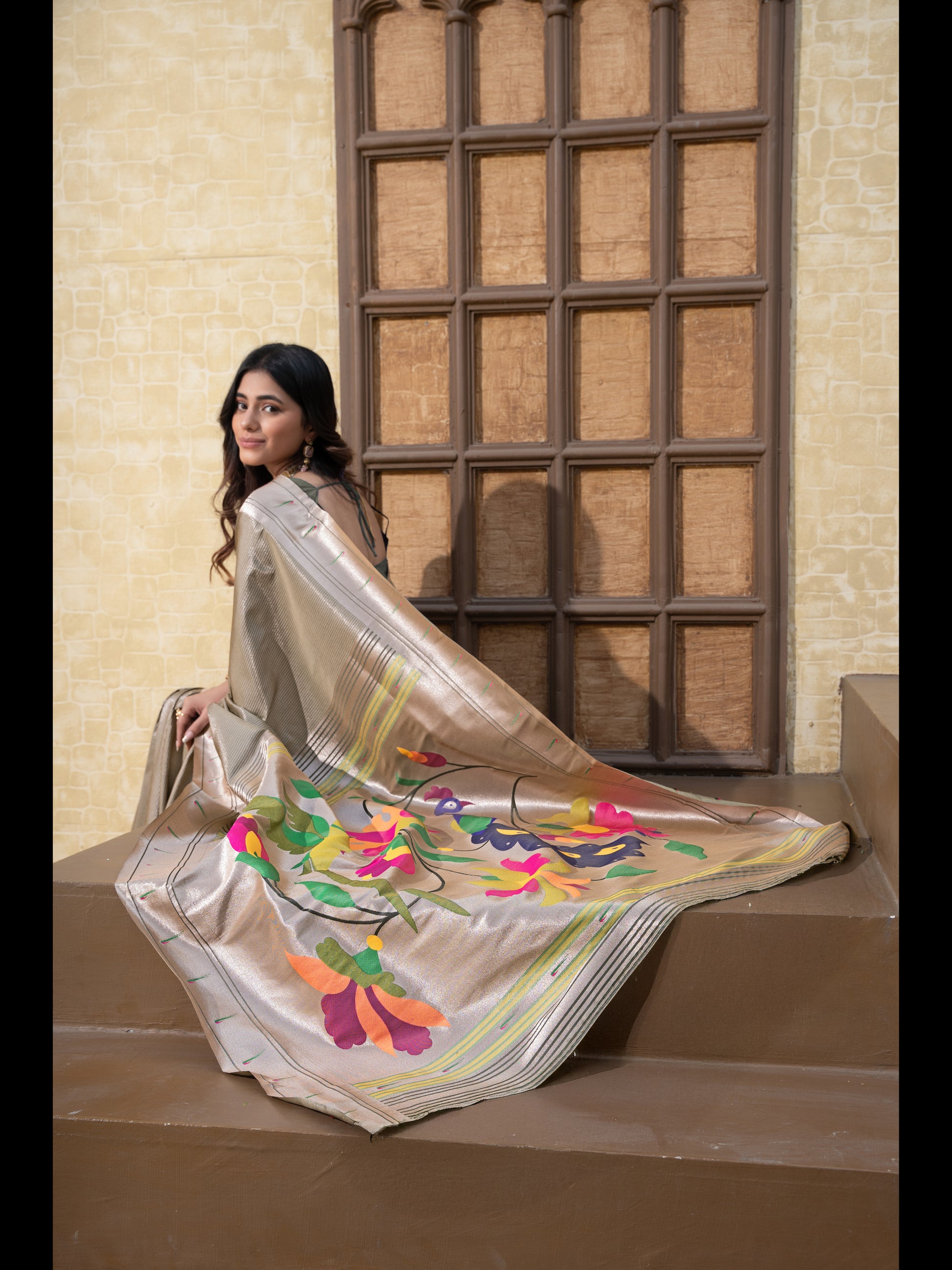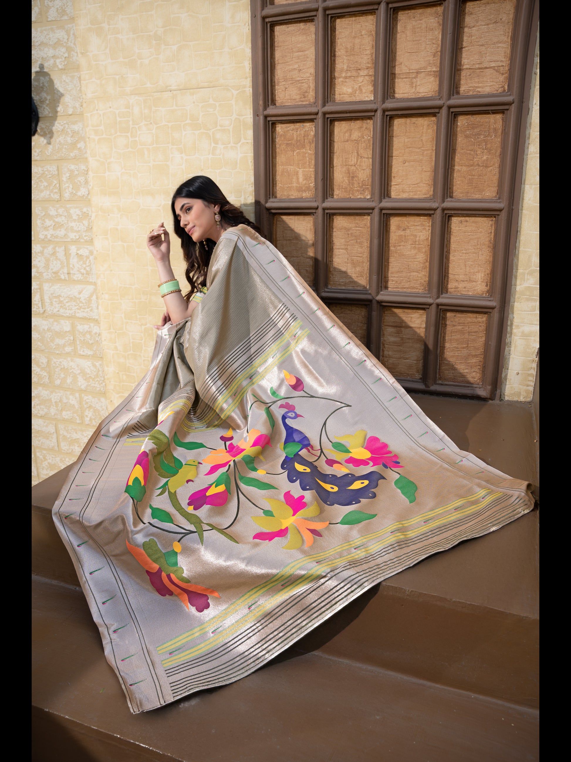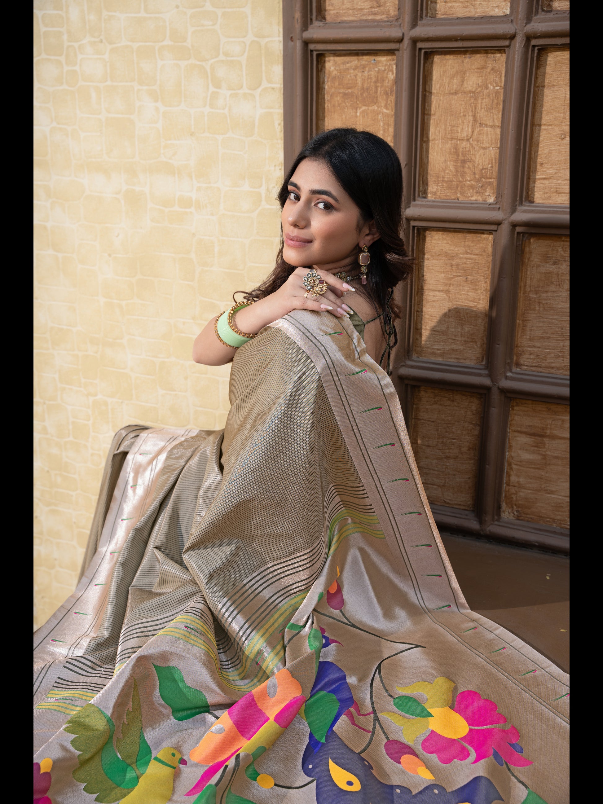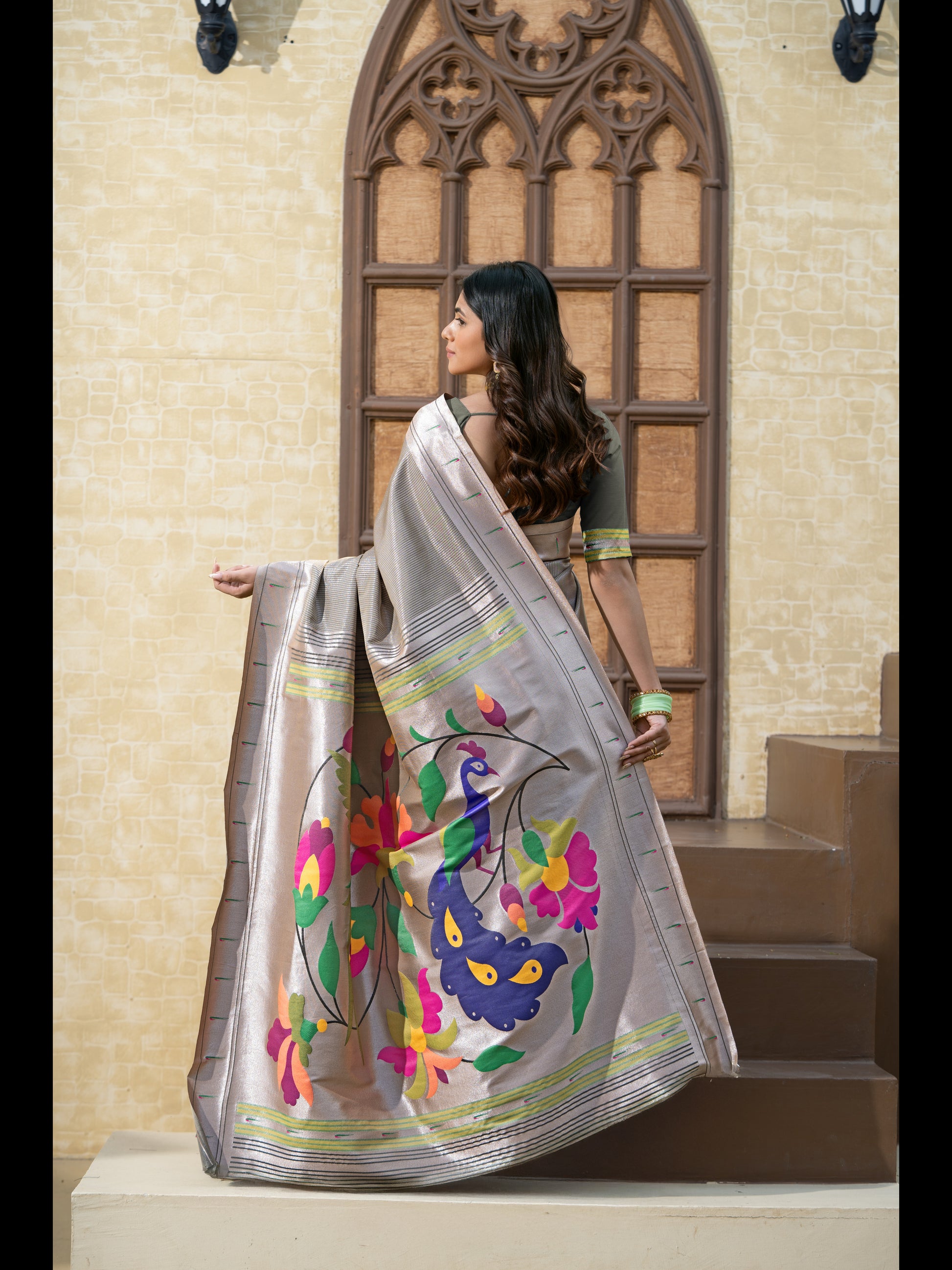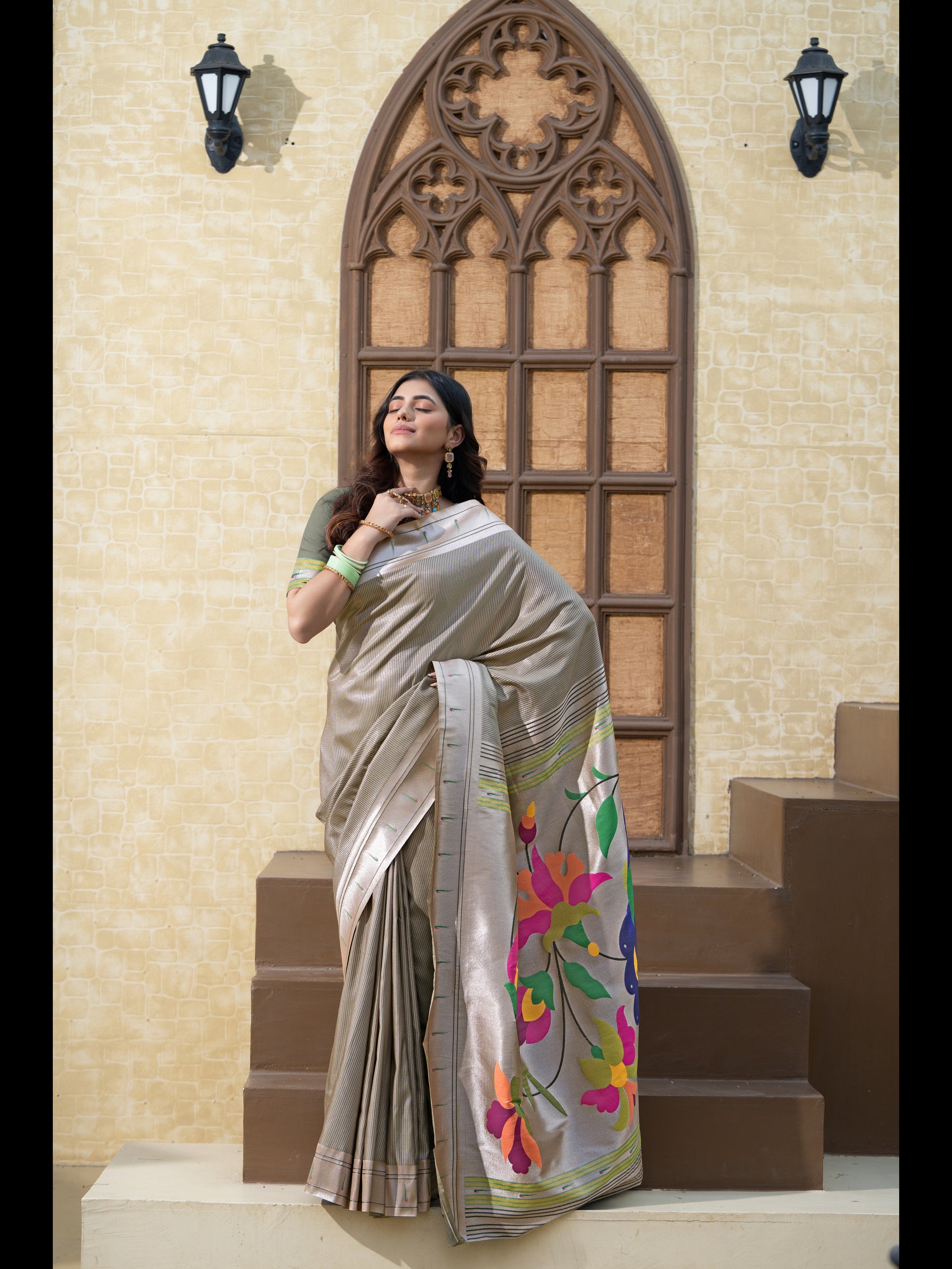 ग्रे रंग की पैठानी मुलायम मिश्रित रेशम ज़री से बुनी हुई साड़ी