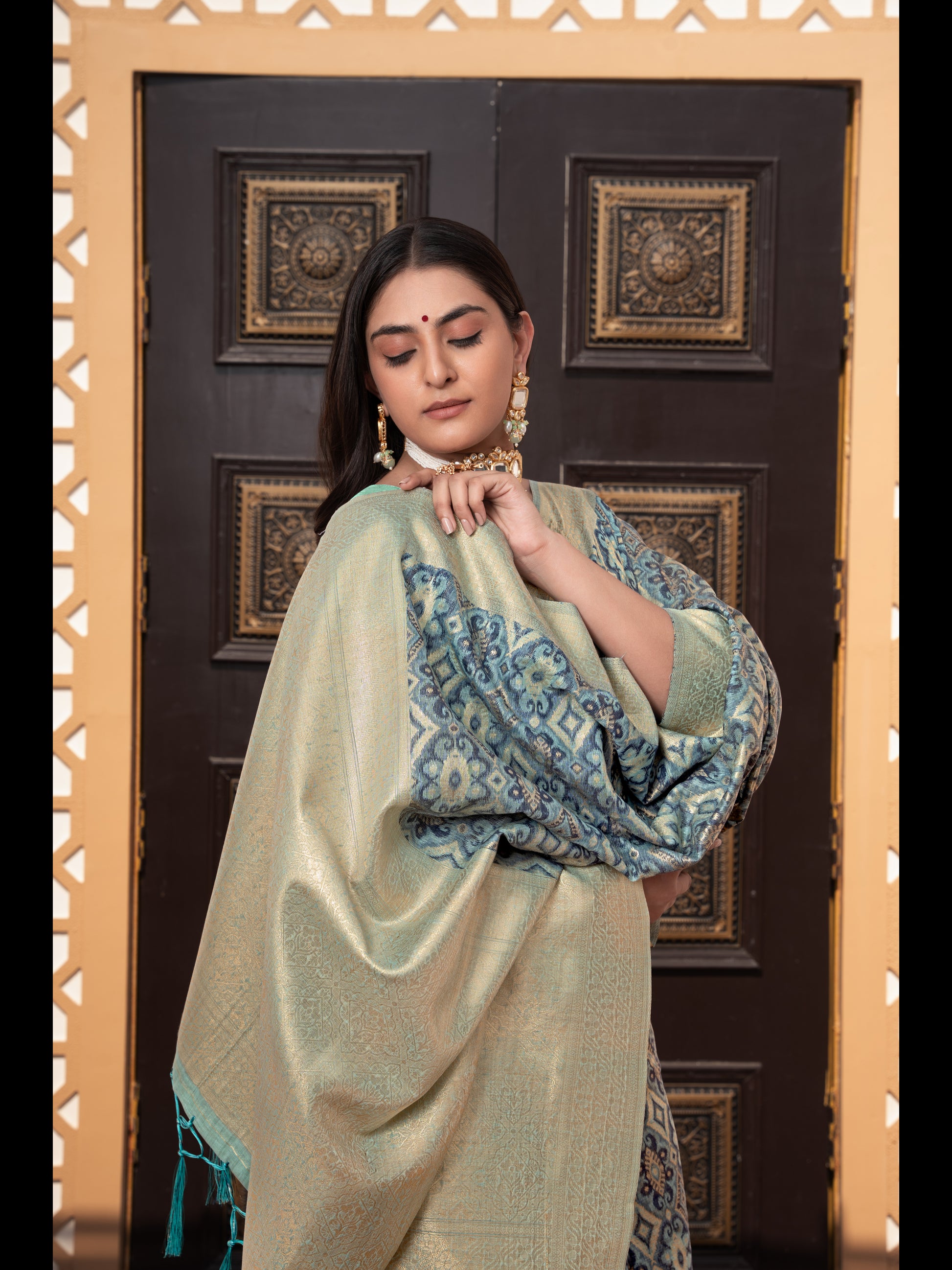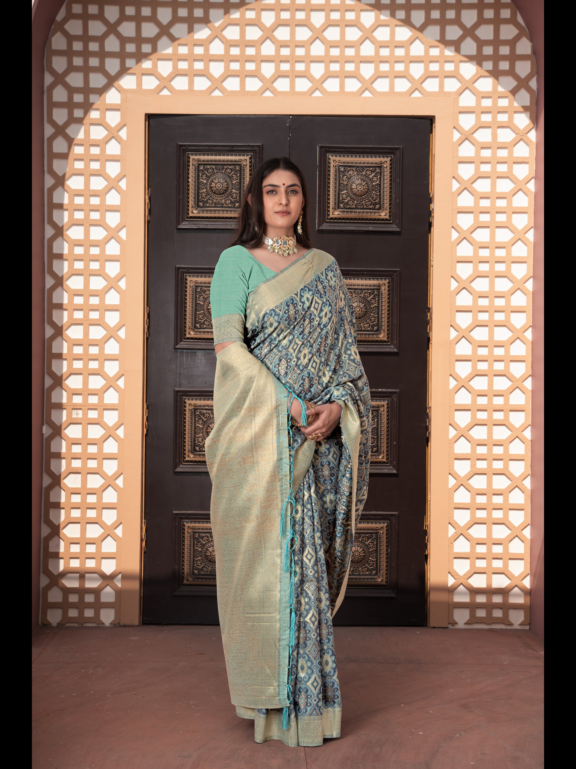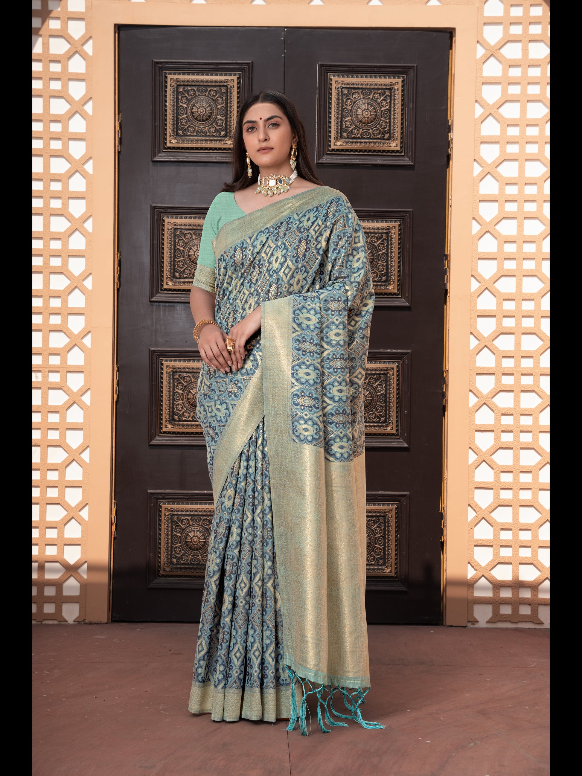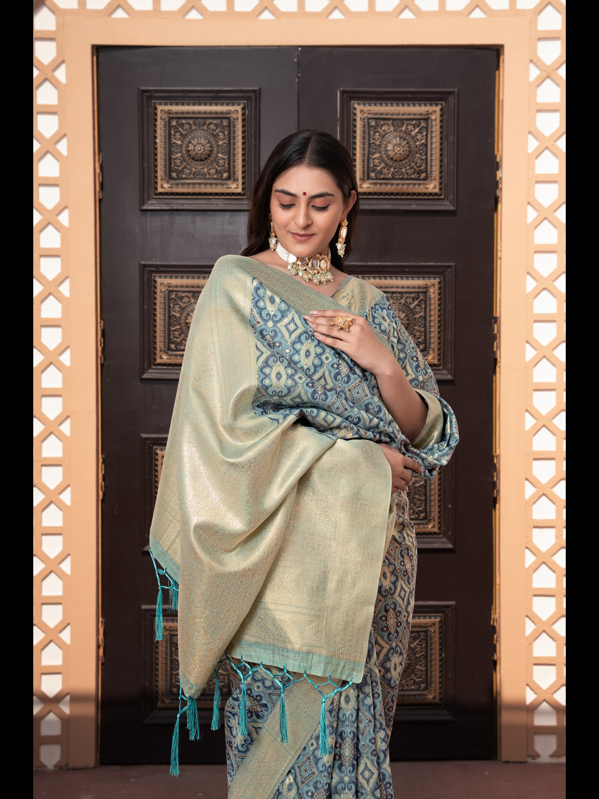 नीले रंग की इक्कत कॉटन इक्कत सिल्क साड़ी ज़री बुनी हुई