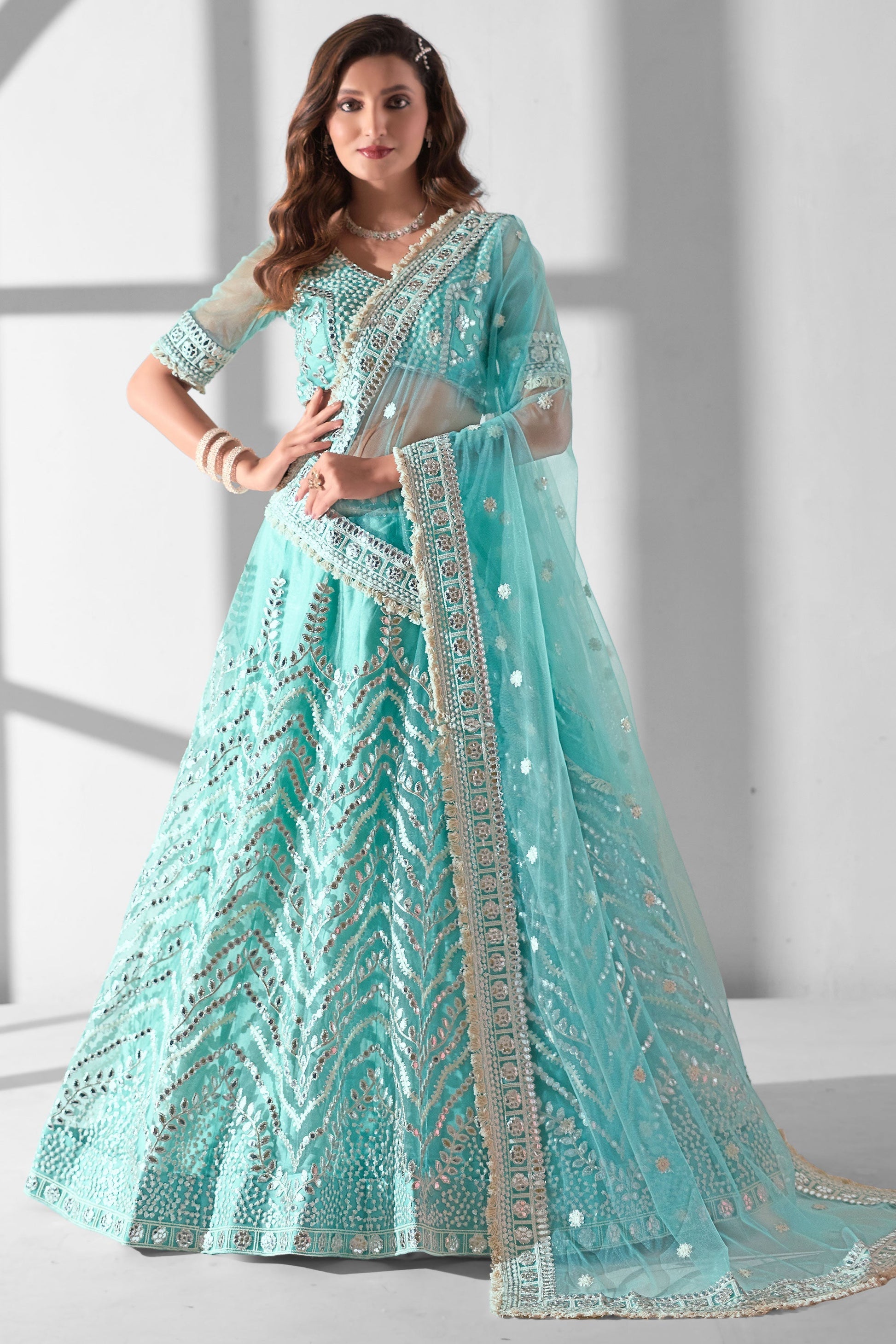 समारोह के लिए समकालीन हल्के सियान रंग नेट फैब्रिक लेहेंगा
