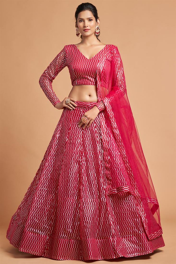 संगीत वियर में रानी कलर नेट फैब्रिक लहंगे पर प्रतिष्ठित कढ़ाई का काम