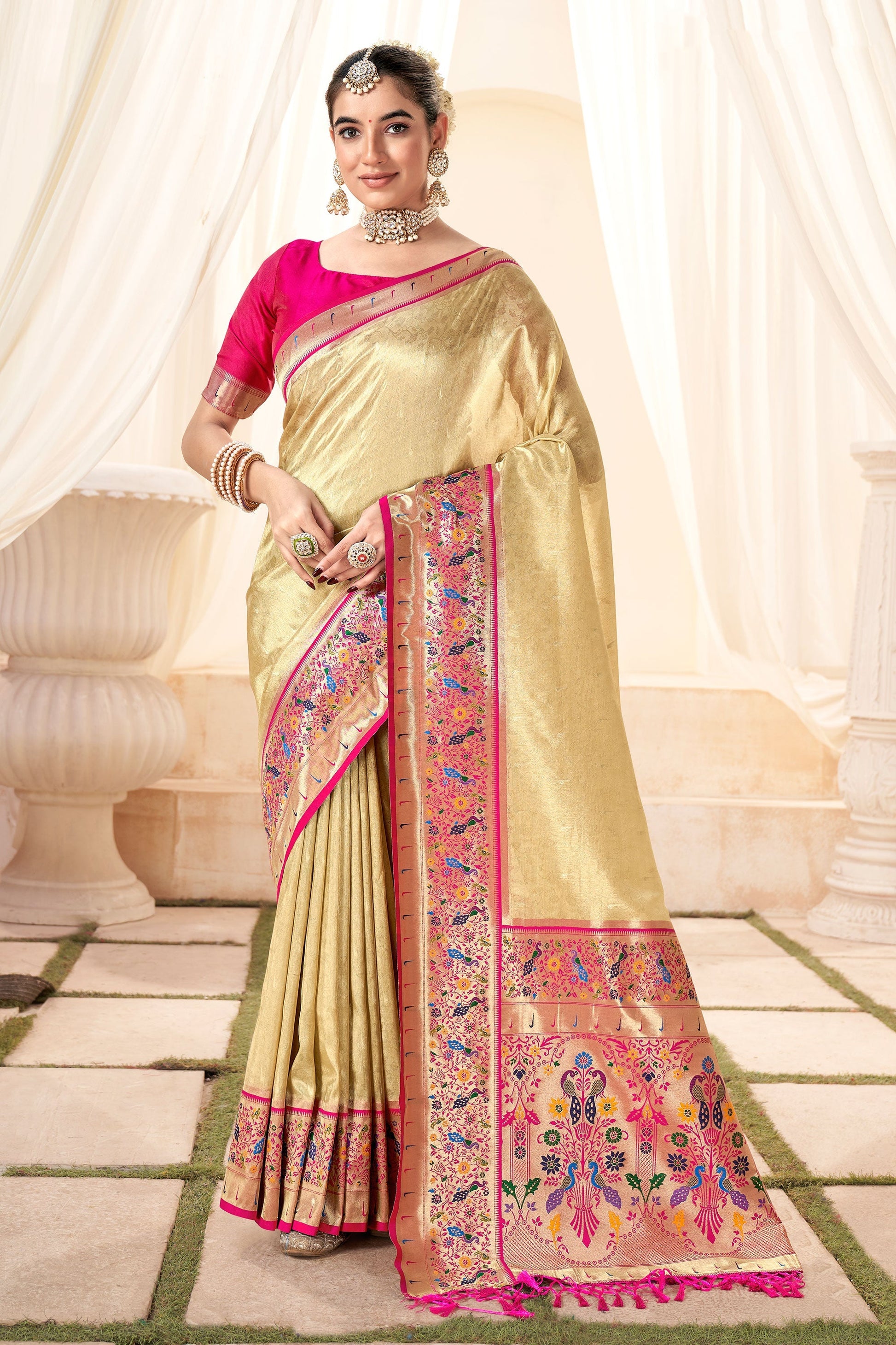 क्रीम रंग की उत्तम फंक्शन वियर हैंडलूम सिल्क साड़ी
