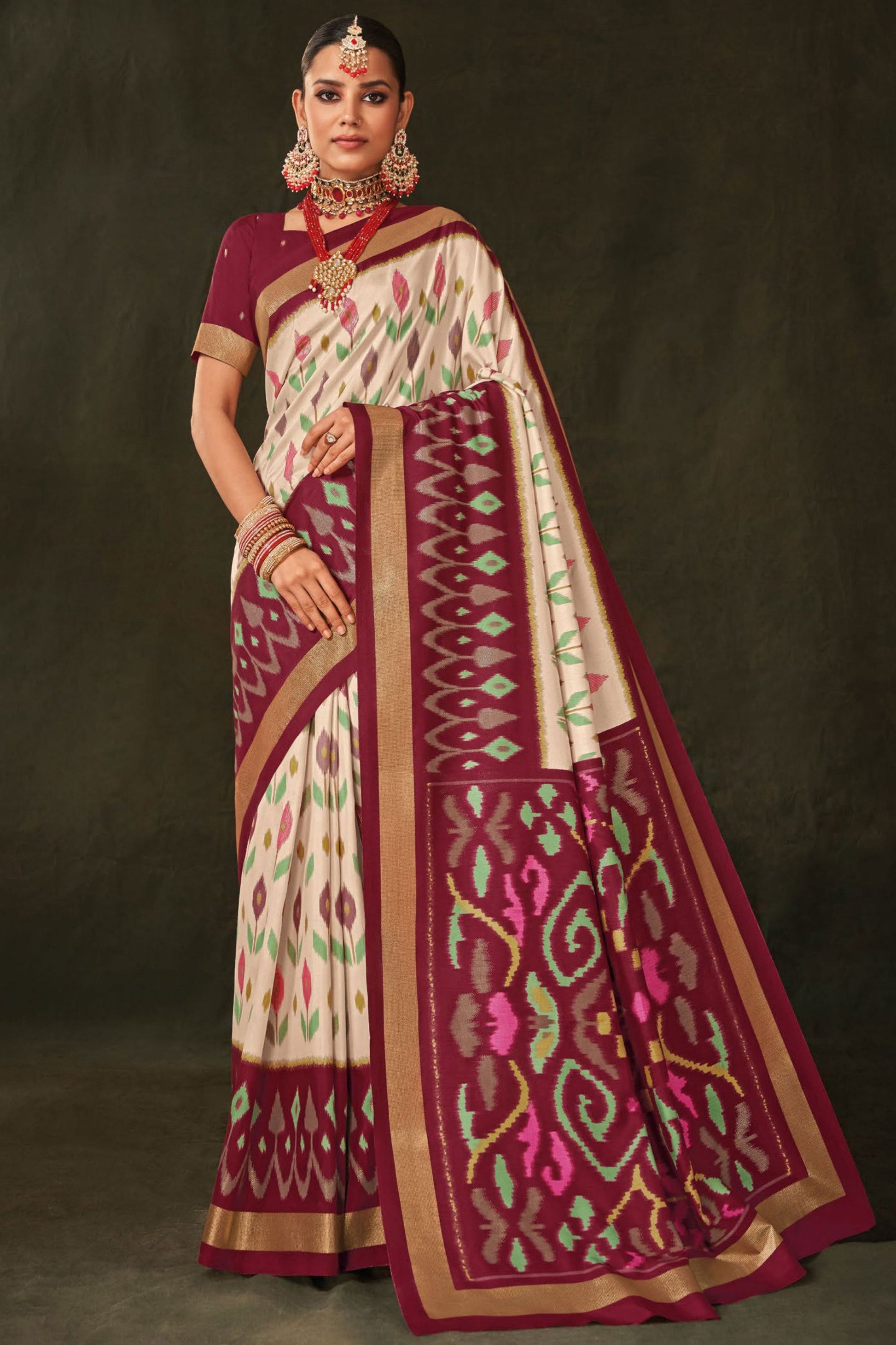 ऑफ व्हाइट कलर आर्ट सिल्क फ़ैब्रिक साड़ी पर क्रिएटिव प्रिंटेड वर्क